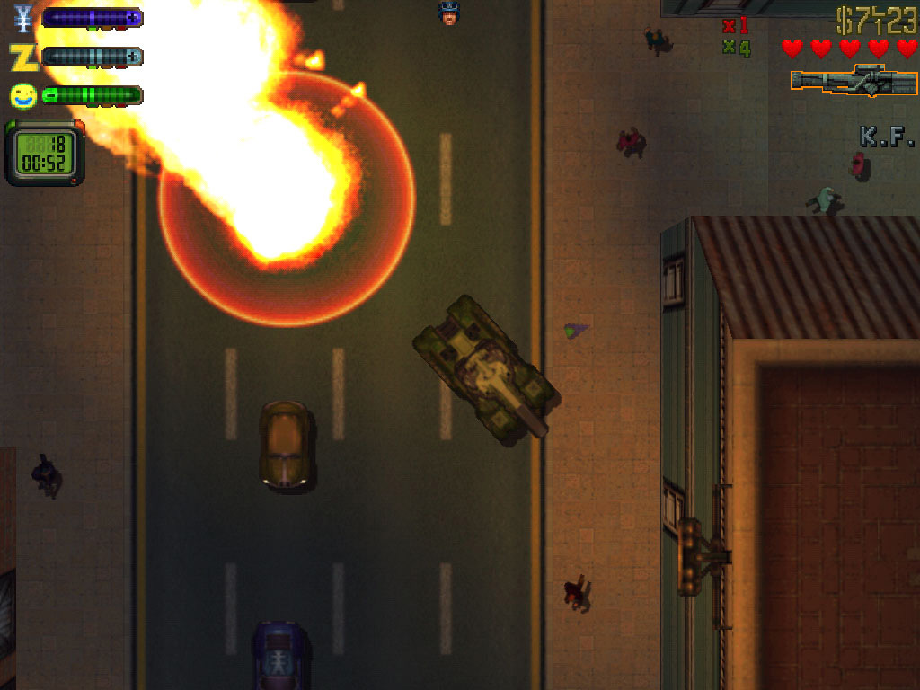シリーズ第1作。見下ろし型の2Dアクションだが,盗んだ車で街中を自由に走り,与えられるミッションをこなしていくという基本形は,このとき出来ていた。ちなみに,ゲームに出てくる三つの町は「Liberty City」「Vice City」そして「San Andreas」。なるほど。追加データ集として,舞台をロンドンに移した「Grand Theft Auto:London1969」がある。