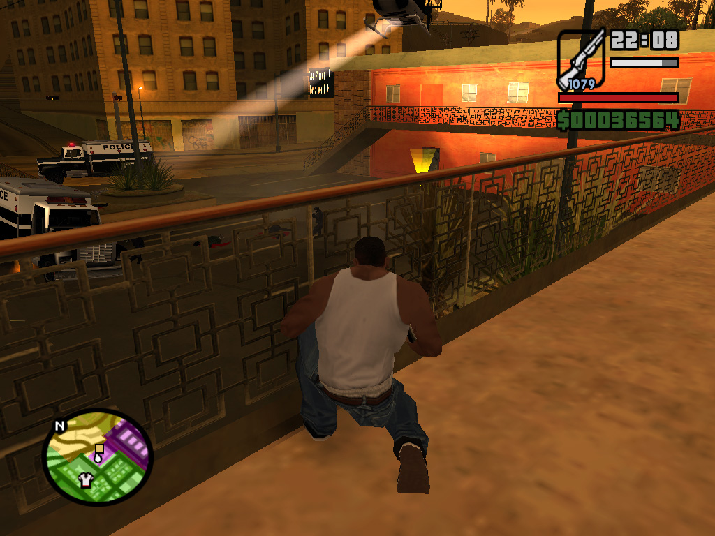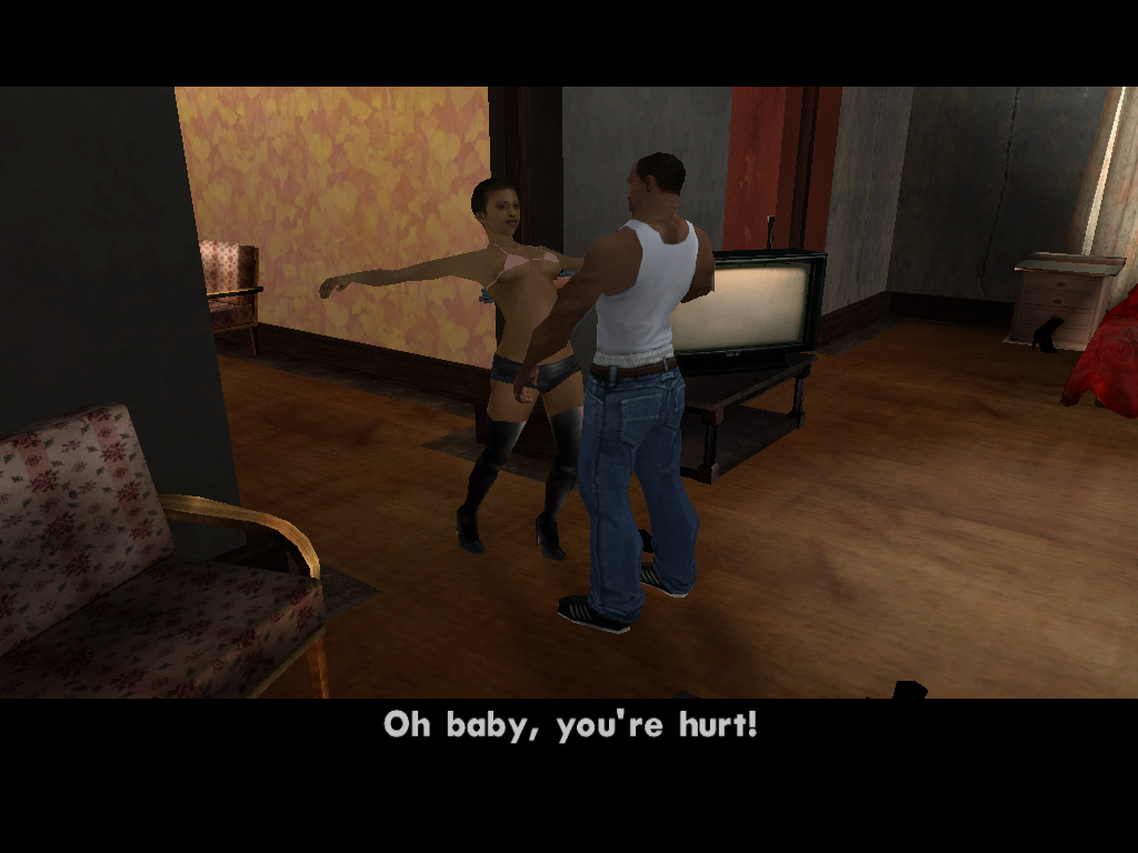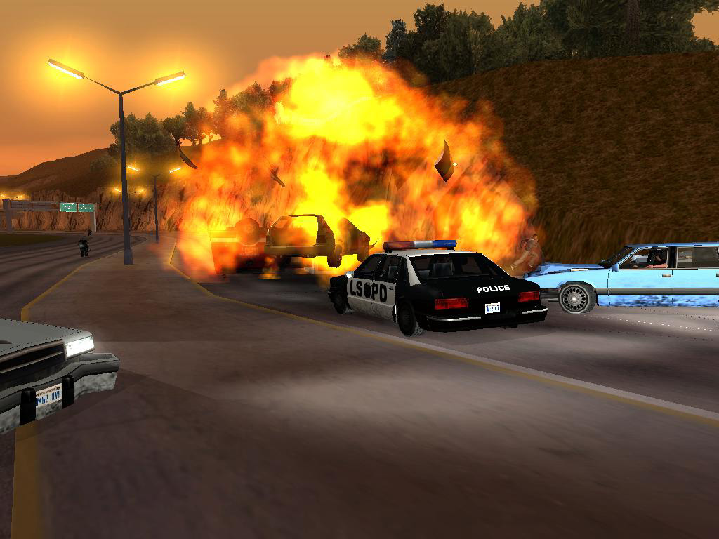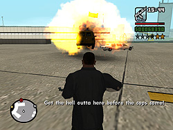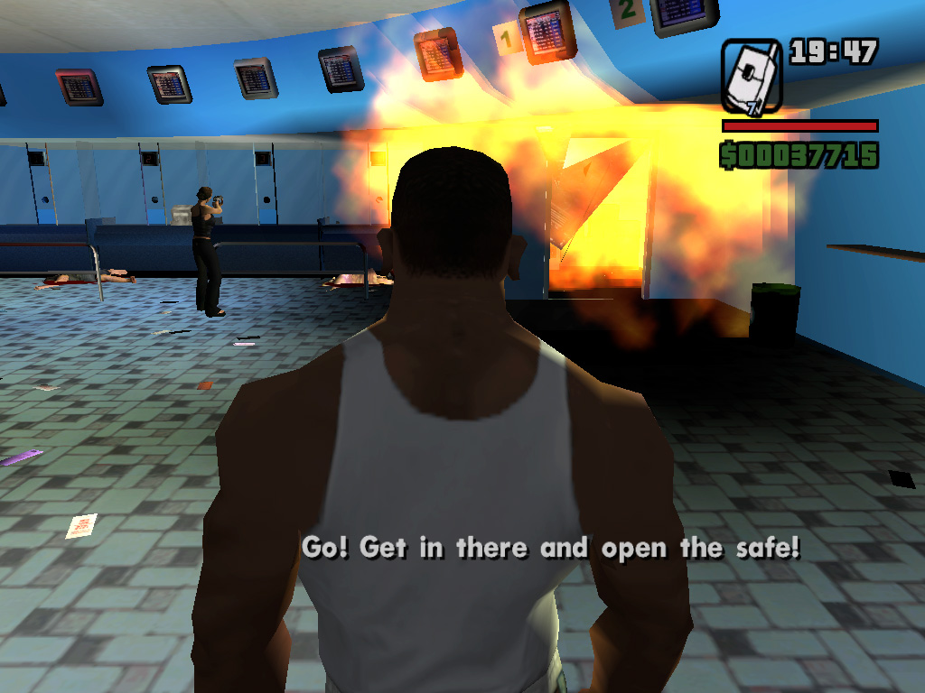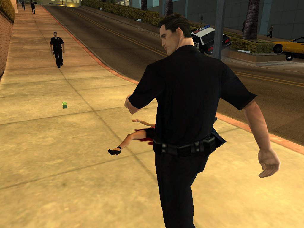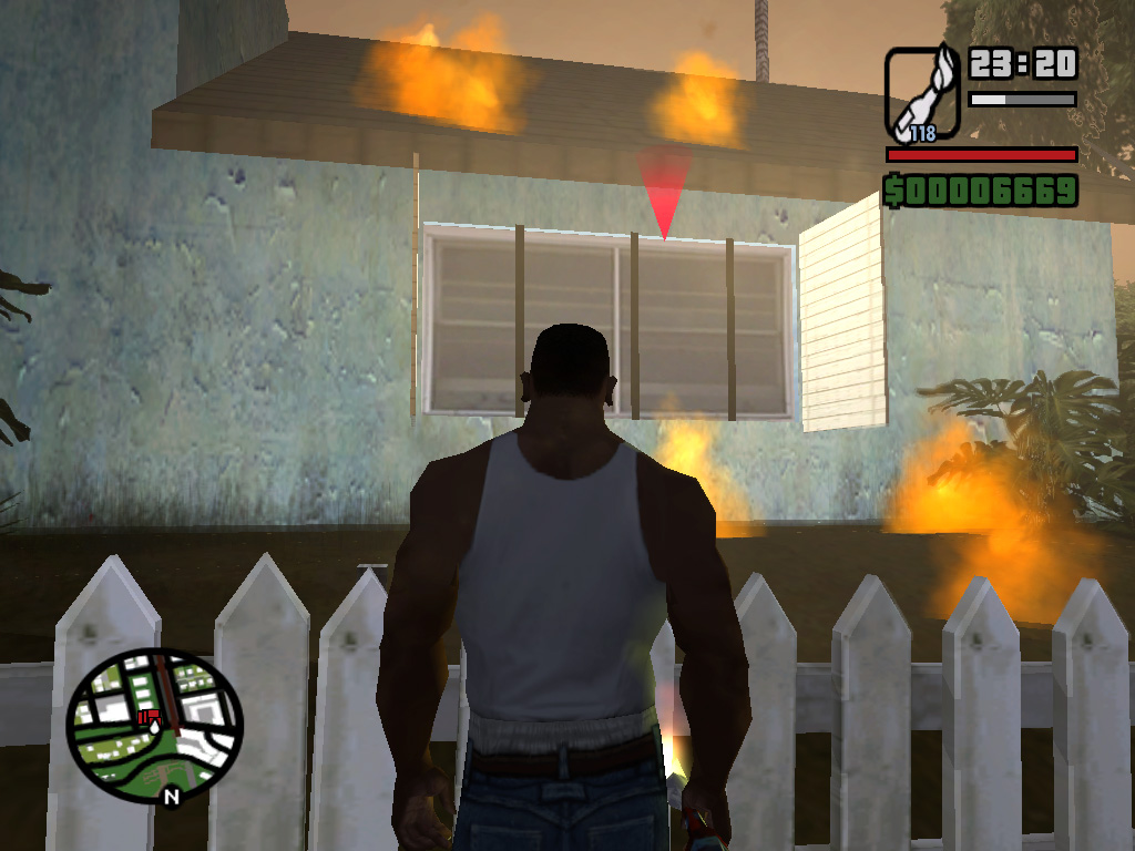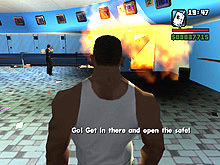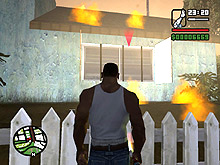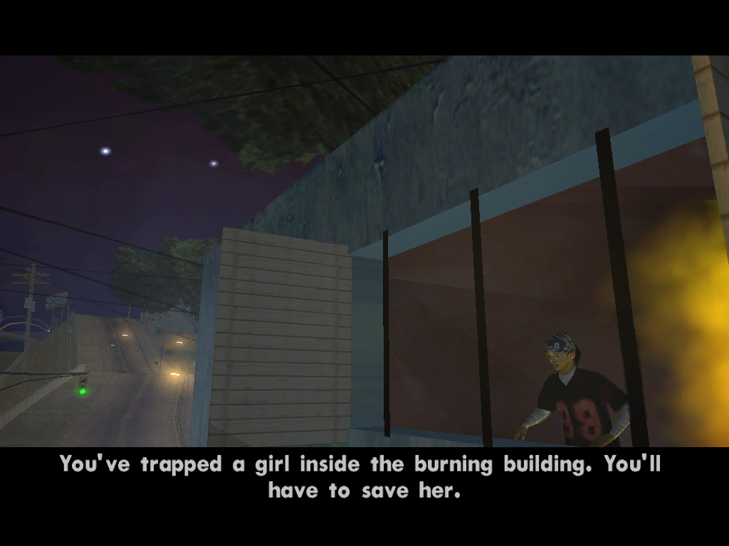 ロス・サントスでは,警官だって立派な悪人だ。自称C.R.A.S.H.という悪徳警官3人組がCJに命じたのは,「俺らに代わって,Vagos(黄)のやつらの頭を冷やしてやれ」というもの。了解,おまわりさん。正義のためだ。かくしてCJは指示されたアドレスに向かい,敵のおしゃれな黄色いバンダナを頭ごと吹き飛ばし,家の中に火炎ビンを投入。めらめらと燃え上がる家。そのときである! ガラスを割って助けを求める一人の少女がいるではないか。