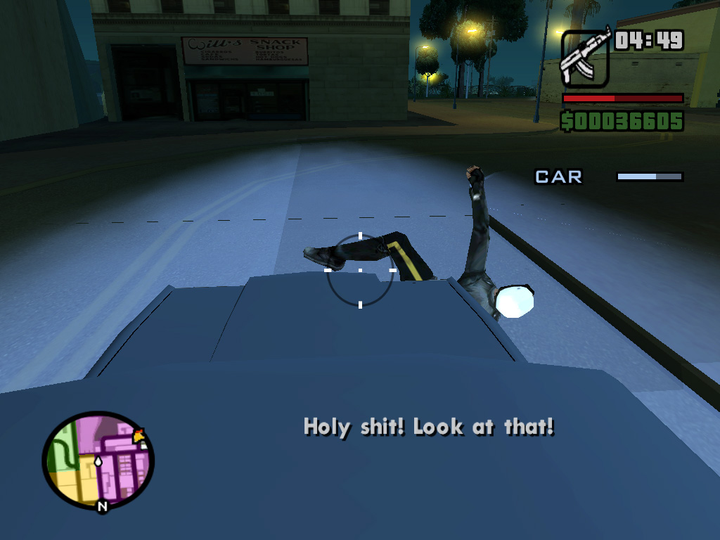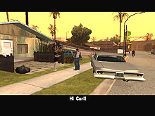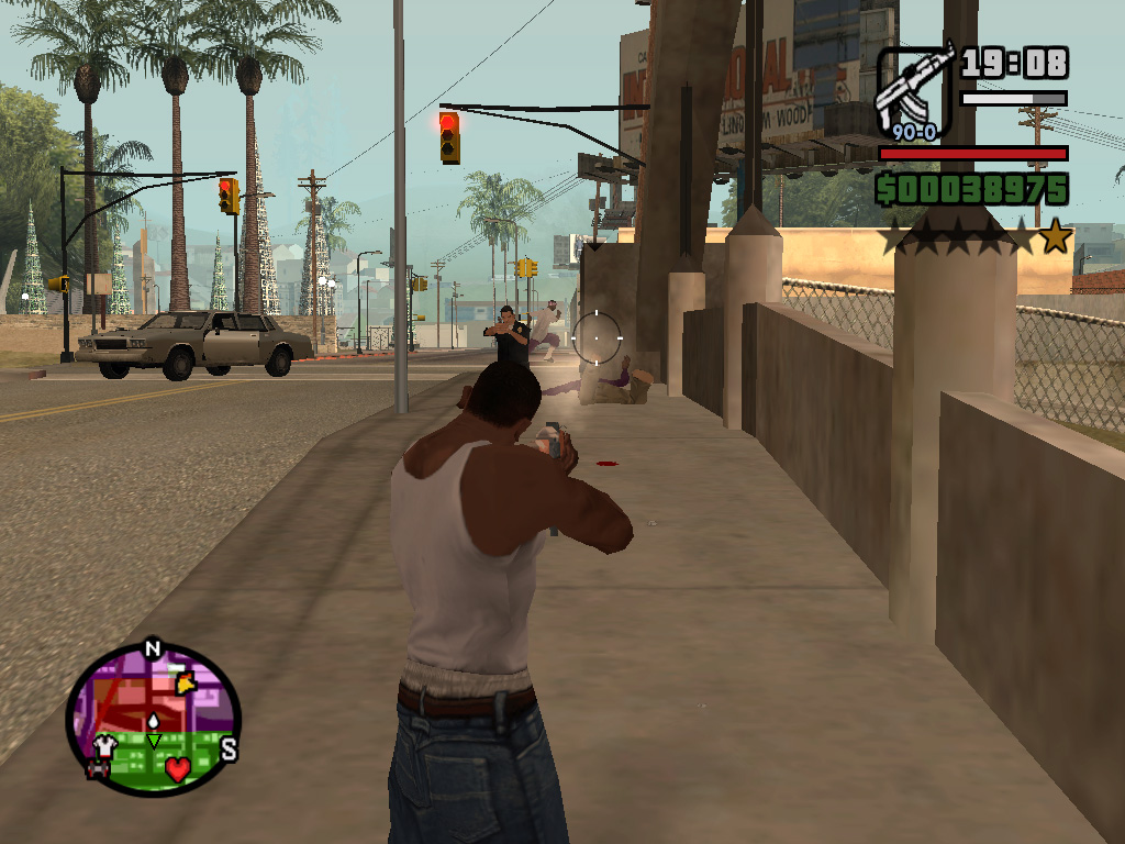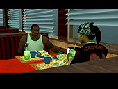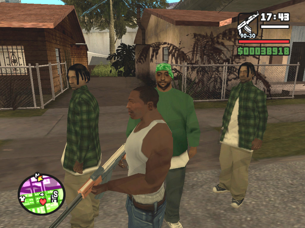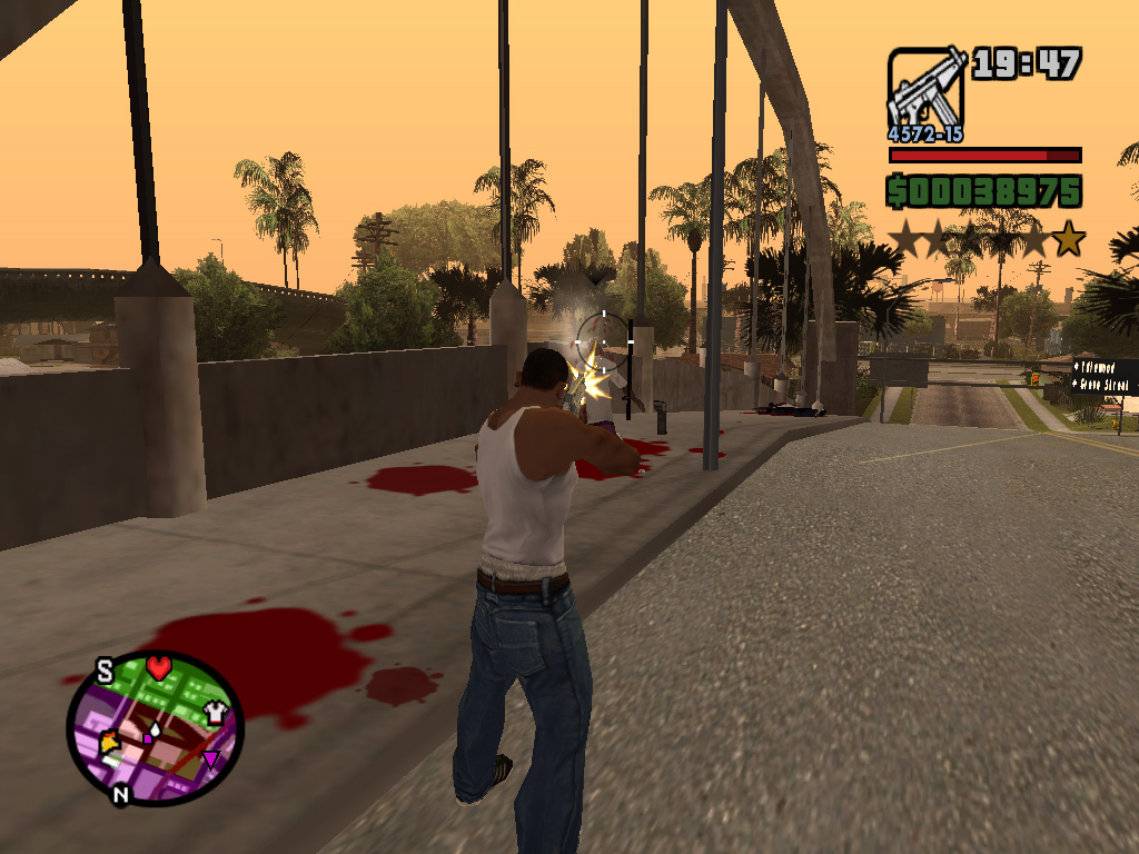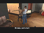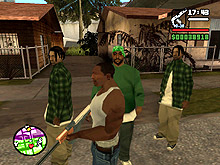 かくして,ほとんど何も考えずに鉄砲玉となったCJはグレン・パークへ出かけて,紫色のウェアがちょっとおしゃれなBallasのやつらを2,3人ほど血祭りに。すると,たちまちお楽しみの「ギャング・ウォー」が勃発する。