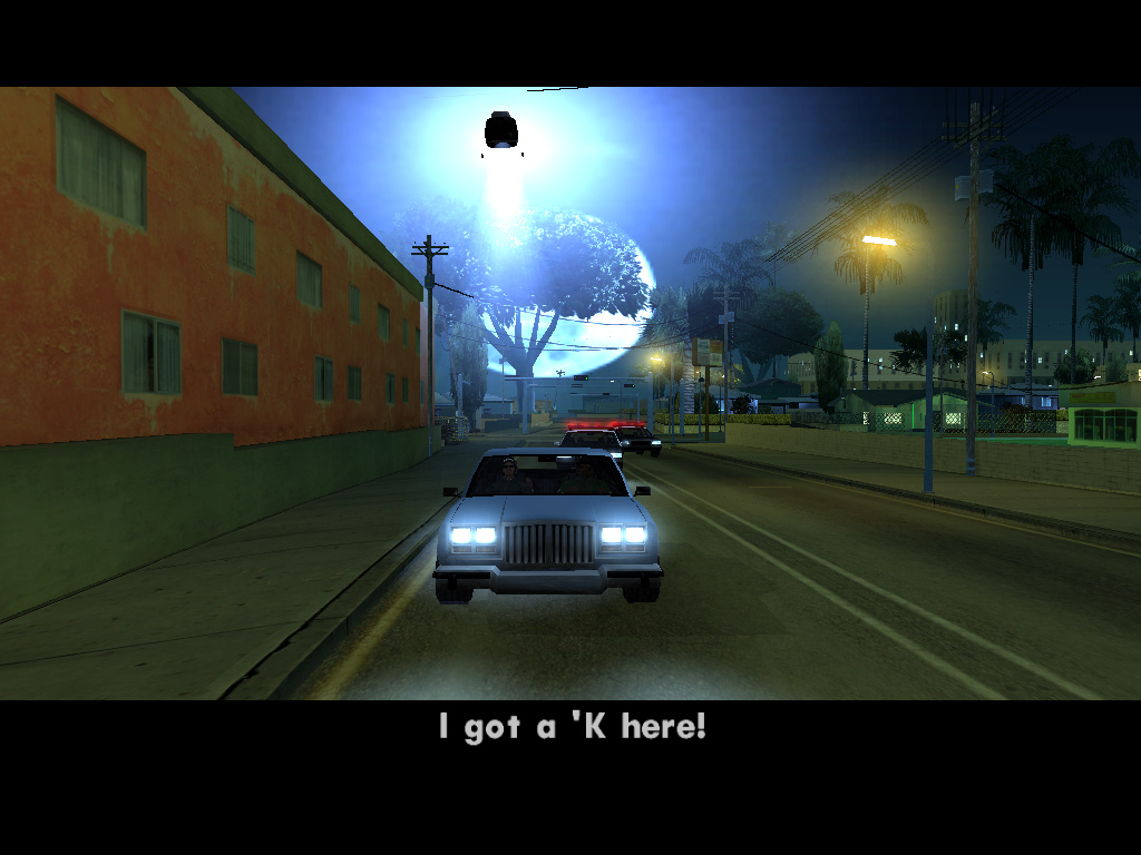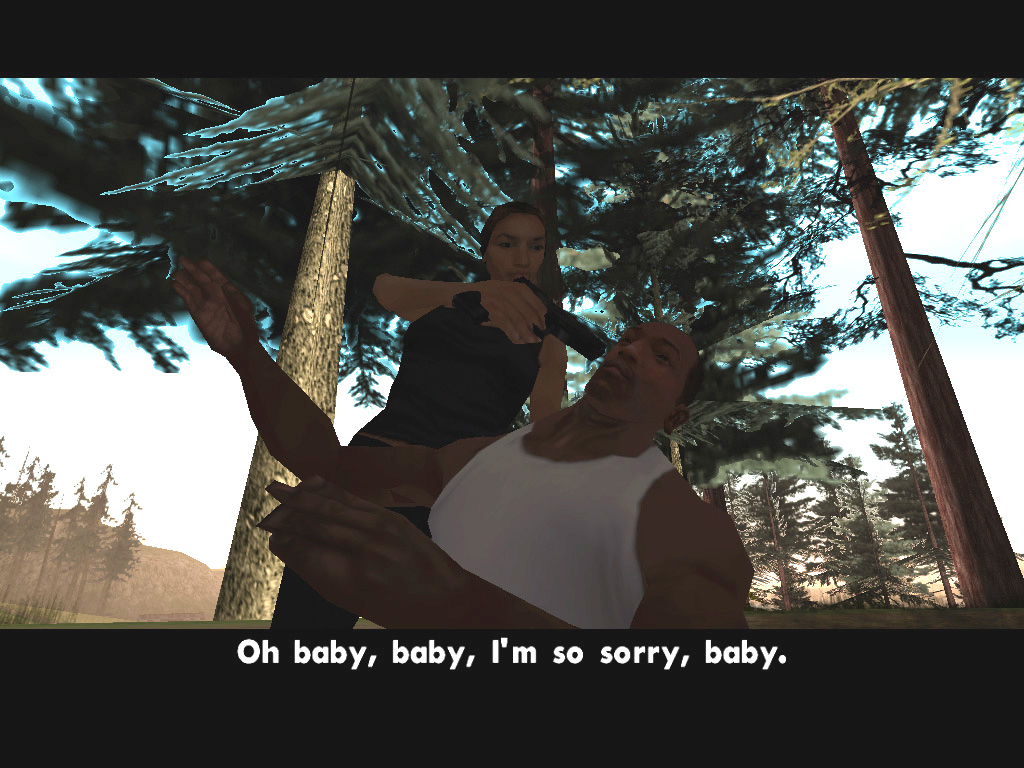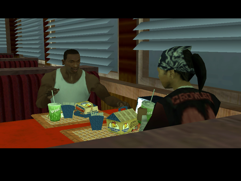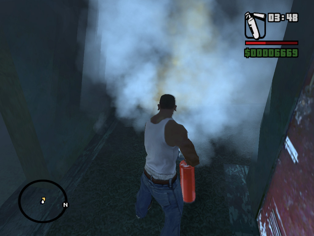 かくして,ほとんど何も考えずに鉄砲玉となったCJはグレン・パークへ出かけて,紫色のウェアがちょっとおしゃれなBallasのやつらを2,3人ほど血祭りに。すると,たちまちお楽しみの「ギャング・ウォー」が勃発する。