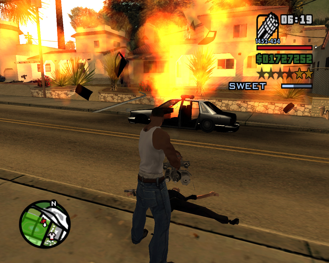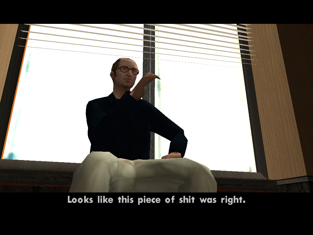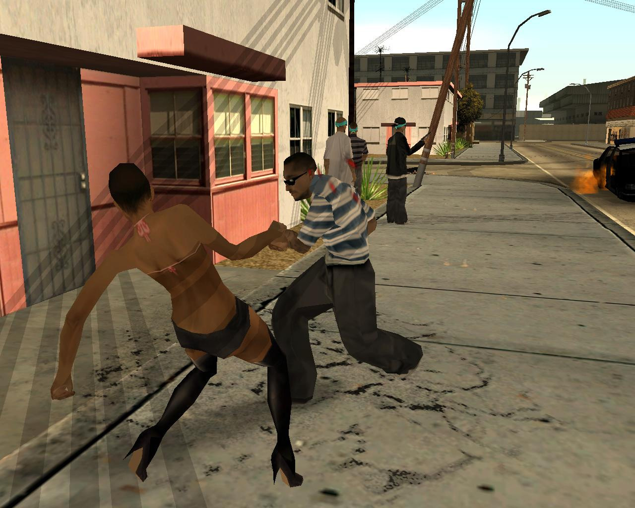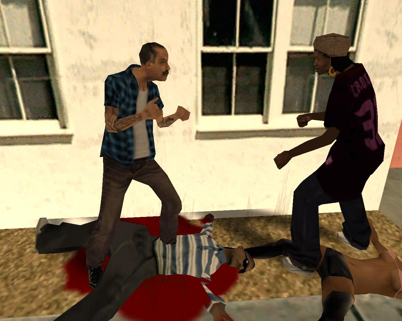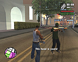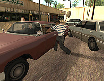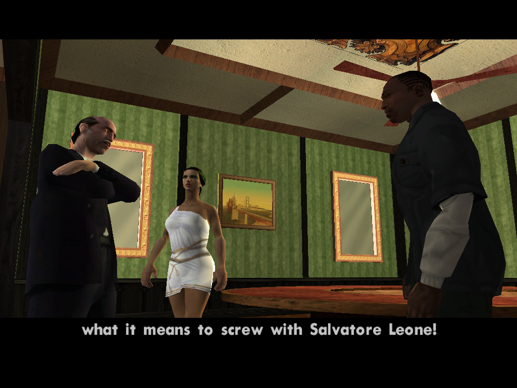 死んだはずのTorenoの計らいで監獄から出られることになった,兄のスィートを迎えに行く主人公カール・ジョンソン(CJ)。「兄貴,久しぶりメーン。無事でよかったガッデム。さあ,家に帰ろう。洋服も買ってやるよ」というCJに「家ってどこだ?」と聞き返す兄。今や,サン・フィエロで手広く事業を行ない,ラス・ベンチュラの巨大カジノの共同経営者となったCJにとって,山の手にあるベッドルームだけで19部屋の豪邸が彼の家。だが,スィートは「グローブ・ストリートが俺の家だファッ○!」とCJを優しく叱るのだ。「兄貴。世の中はグローブ・ストリートなんかよりずっと広いんだぜアスホール」と反発するCJだが,やがて兄に従い,懐かしの我が家に帰ることを誓う。ジョンソン兄弟の熱い郷土愛が伝わって,思わずホロリとする場面である。帰って何するか,っちゅうとアレなんだけど。