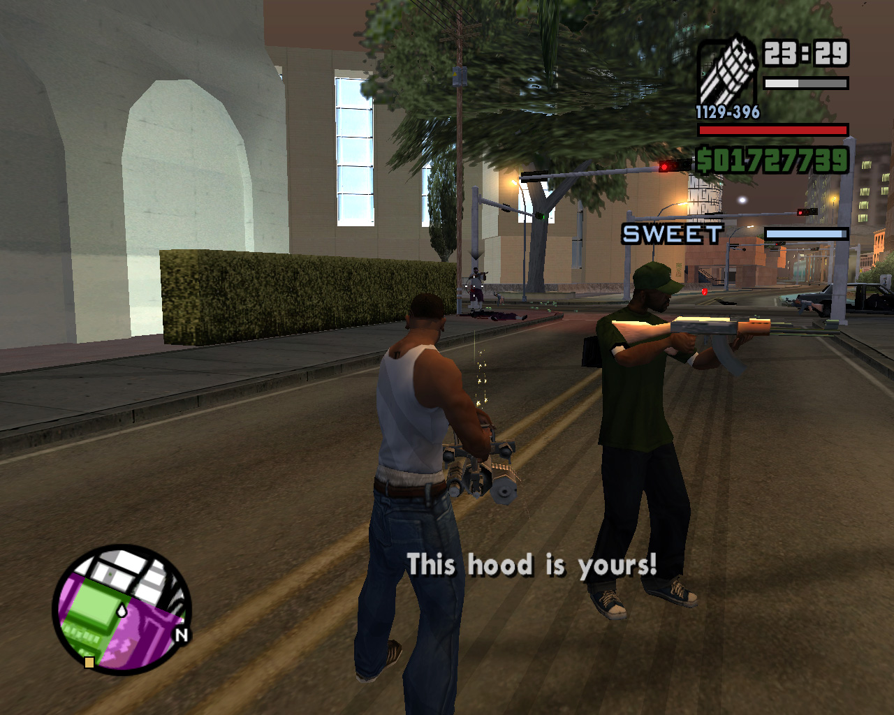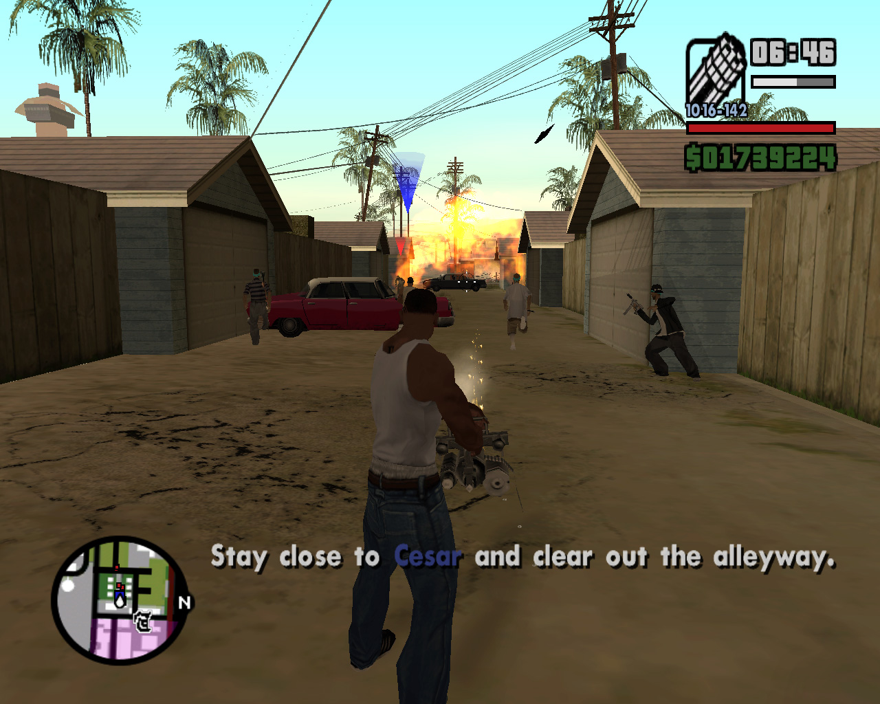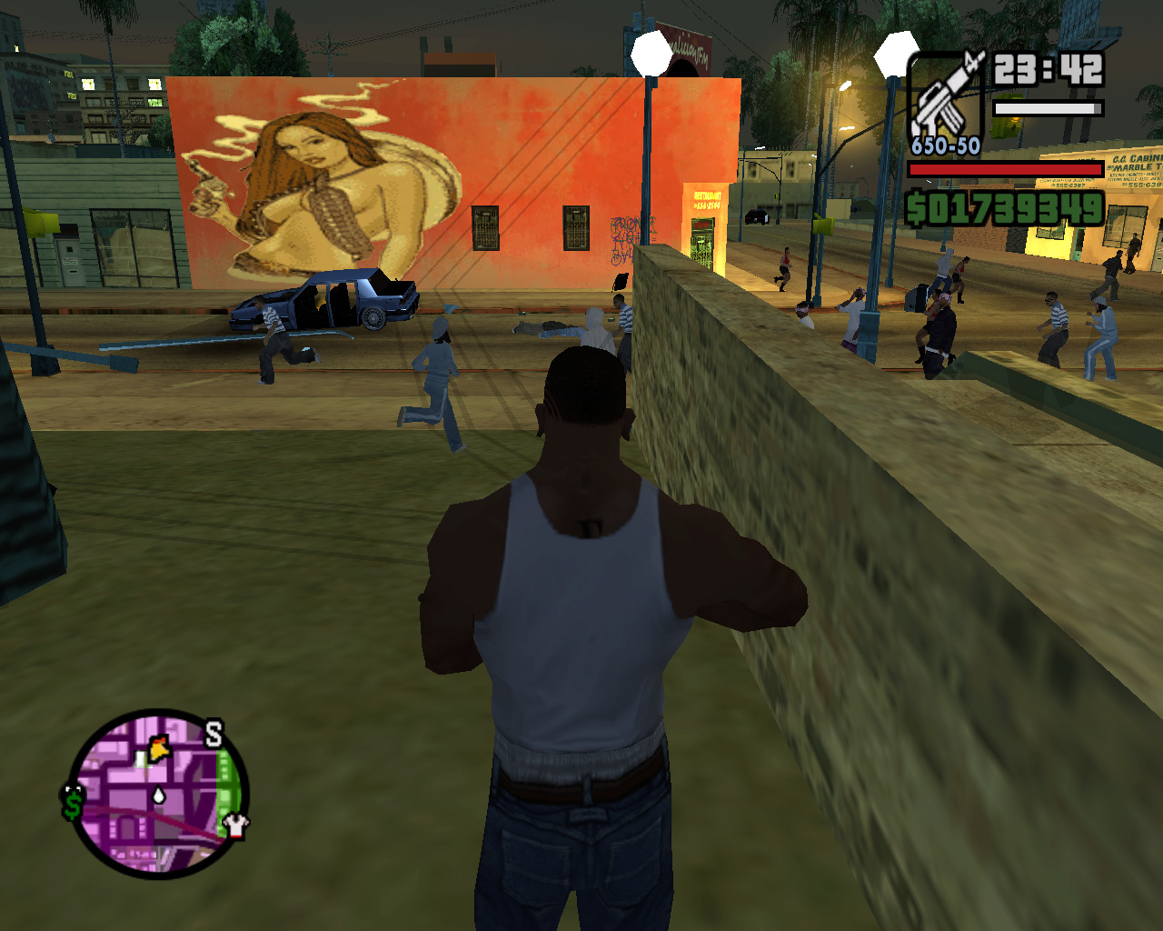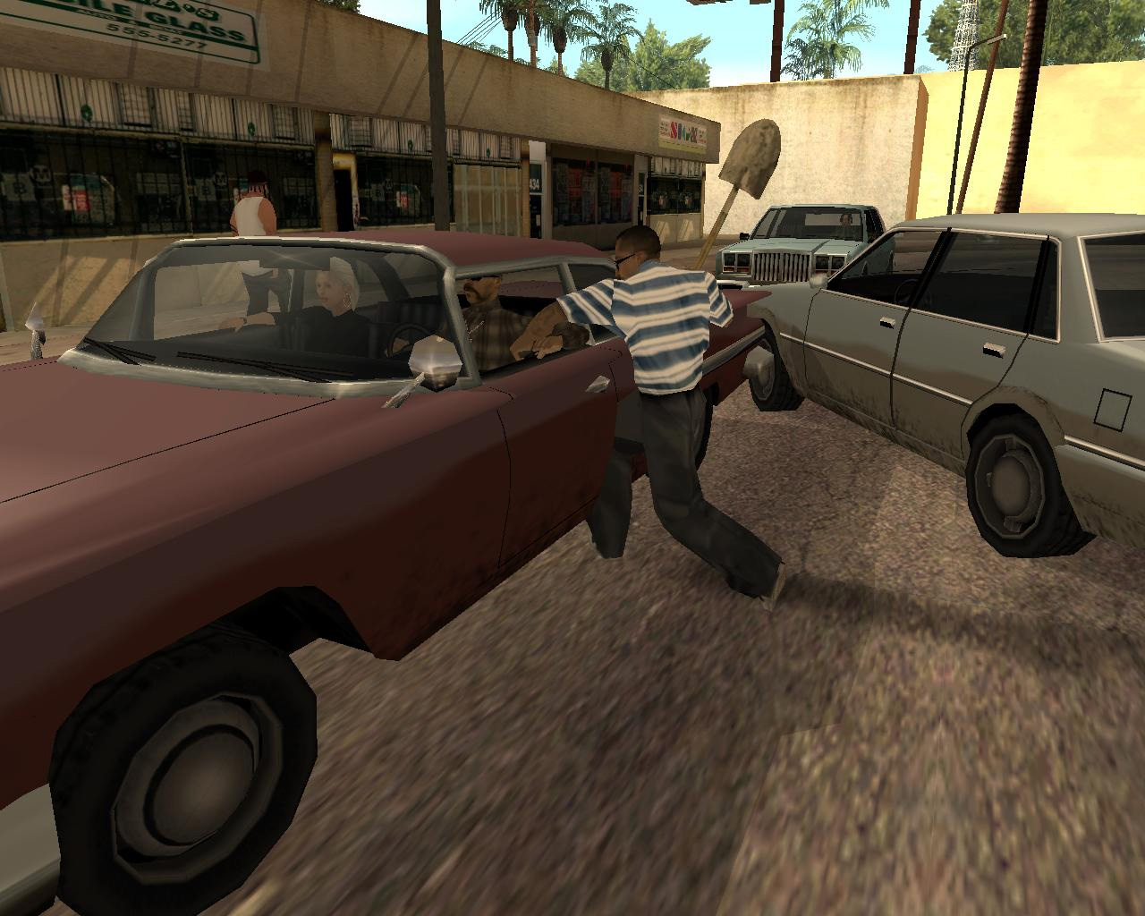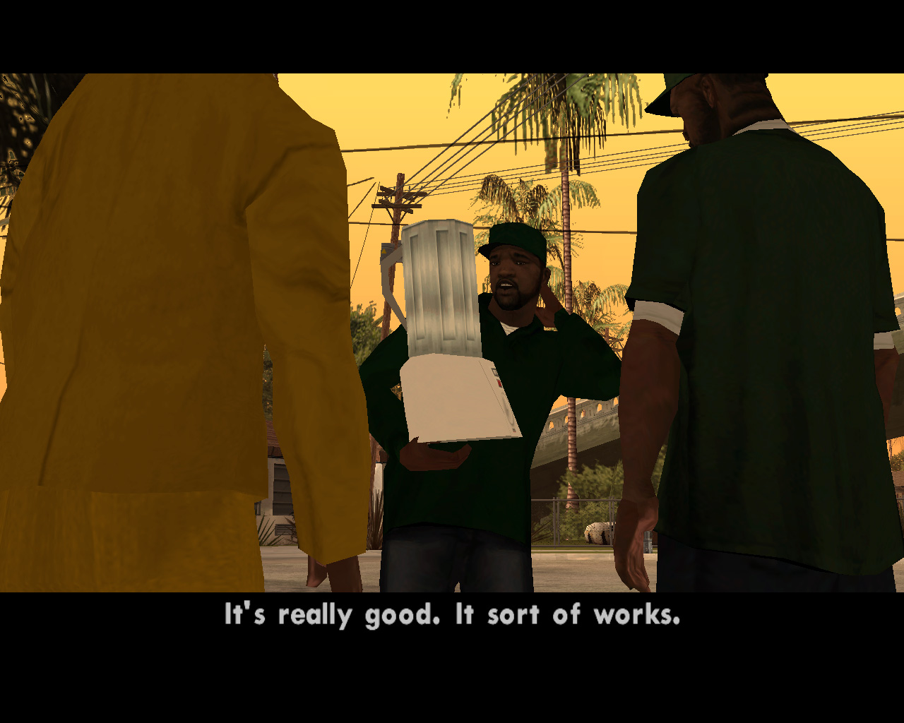 死んだはずのTorenoの計らいで監獄から出られることになった,兄のスィートを迎えに行く主人公カール・ジョンソン(CJ)。「兄貴,久しぶりメーン。無事でよかったガッデム。さあ,家に帰ろう。洋服も買ってやるよ」というCJに「家ってどこだ?」と聞き返す兄。今や,サン・フィエロで手広く事業を行ない,ラス・ベンチュラの巨大カジノの共同経営者となったCJにとって,山の手にあるベッドルームだけで19部屋の豪邸が彼の家。だが,スィートは「グローブ・ストリートが俺の家だファッ○!」とCJを優しく叱るのだ。「兄貴。世の中はグローブ・ストリートなんかよりずっと広いんだぜアスホール」と反発するCJだが,やがて兄に従い,懐かしの我が家に帰ることを誓う。ジョンソン兄弟の熱い郷土愛が伝わって,思わずホロリとする場面である。帰って何するか,っちゅうとアレなんだけど。