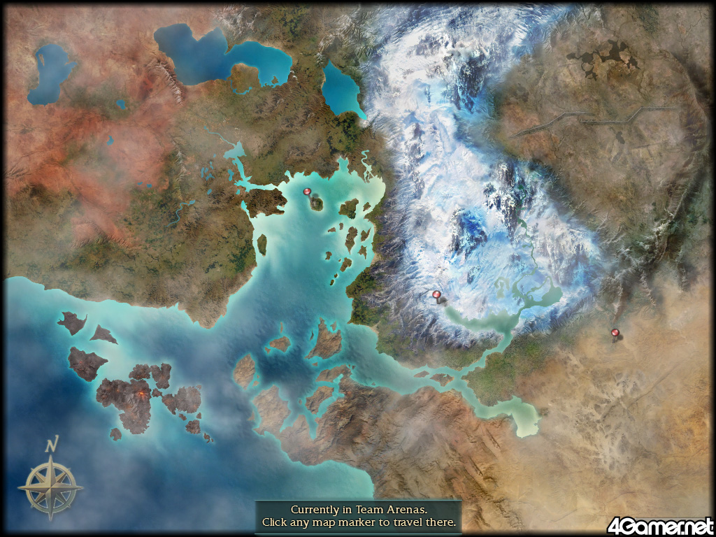 なお,"Compettion Arenas"で広域マップ画面に切り替えると,三つのエリアの間に限って移動できる。実はそれぞれの対人戦のゲームモードが,エリアによって分けられているのだ。エリア名に沿って再度説明しておくと,"Team Arenas"は4 vs. 4のチーム戦,"Tomb of Primeval Kings"は8 vs. 8のチーム戦それぞれの専用エリアとなっている。Guild Tournamentについては,次回あらためて説明しよう。
