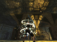 | E3では「Dungeons & Dragons Online」の評判は上々で,その後,MMORPGファンの間で人気がうなぎ上り。テーブルトーク風の込み入ったルールは感じられないが,マニアも納得できる仕様が盛りだくさんだ |