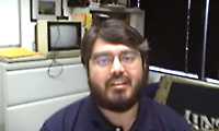 | Raph Koster氏は,元々は「Ultima Online」のデザインチームに在籍していた。今やSony Online Entertainmentで最高制作責任者という地位に上り詰め,ゲーム開発の一切を取り仕切るだけでなく,米国ゲーム業界のオピニオンリーダーの一人として活躍している。写真は,筆者は初めての体験だったビデオカンファレンスより |