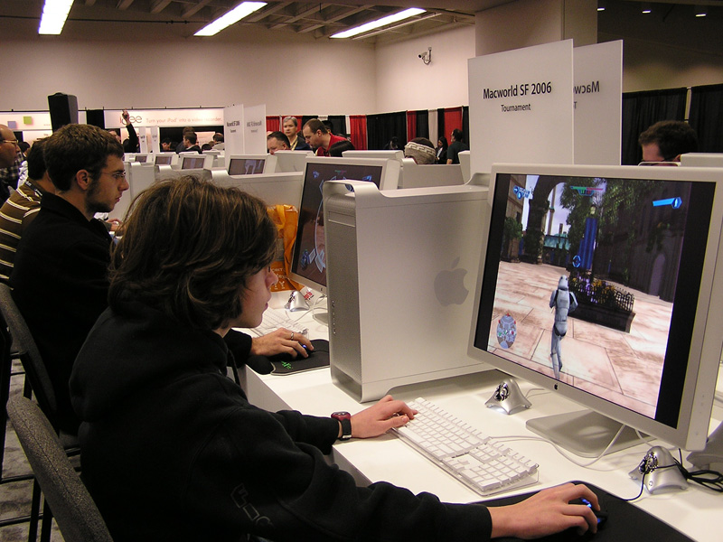 さて,今回Macworld会場のゲームアーケードブースでは,2004年に引き続いて,「Unreal Tournament 2004」や「Star Wars: Battlefront」のトーナメントが行われており,若者達が(学校も行かずに?)昼間から集まって,対戦に興じていた。