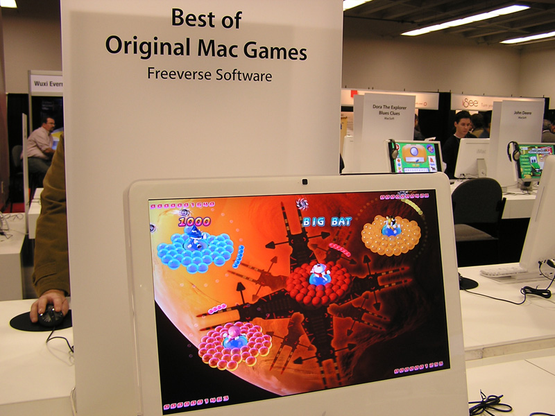 今年のMacworldでとくに目立っていたのが,Mac用ゲームで知名度の高いFreeverseだ。同社は,昨年にも「Toy Sight」を出展してApple Design賞を獲得していたが,今年はテーブルテニスのようにボールを跳ね返し,キャラクターの周りのバブルを弾けさせていく「Airburst Extreme」などカジュアル系の独創的な作品を出展していた。