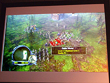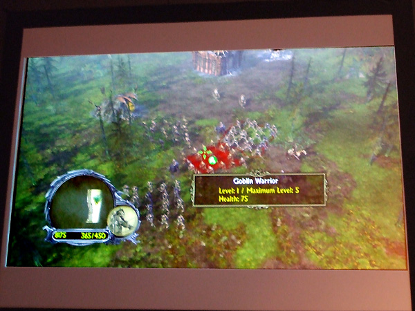 プロジェクタから直接撮影したので画像は悪いが,左下のマップの周囲のアイコンが消え,インタフェースや操作面で簡素化されているのが分かるXbox 360用のBattle for Middle-Earth II。緑色のレティクルが中央に固定されている