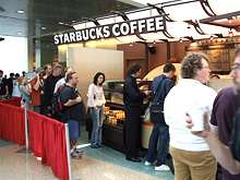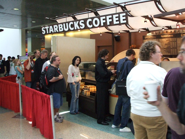 今年の会場で最も長い列を作っていた人気ブースは,「Spore」でも「Scarface: The World is Yours」でもない。コンベンションセンター内にあるStarbucks Coffeeなのだ