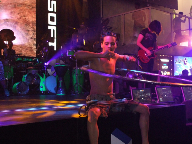 フラフープを使ったセクシュアルなダンスで,昨年に引き続き女性来場者の目を釘付けにしていたNCsoftのブースボーイ