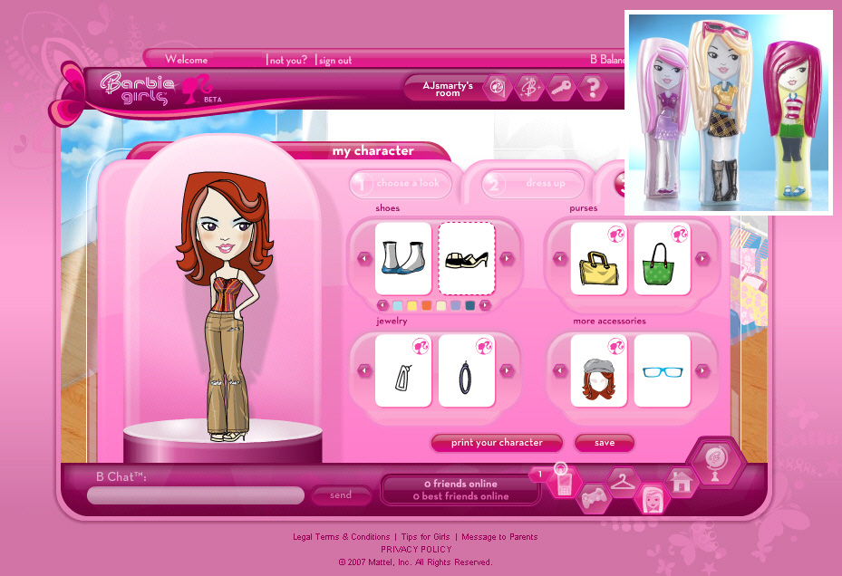 夏休みも手伝ってか,まだβ版なのに3か月で400万アカウントを獲得した女の子向けのSNS「Barbie Girls」。無料で楽しめるのだが,右上の囲み写真のような人形型のMP3 Playerを購入してPCと連動させることで特典が得られるという,タイアップ戦略も垣間見られる