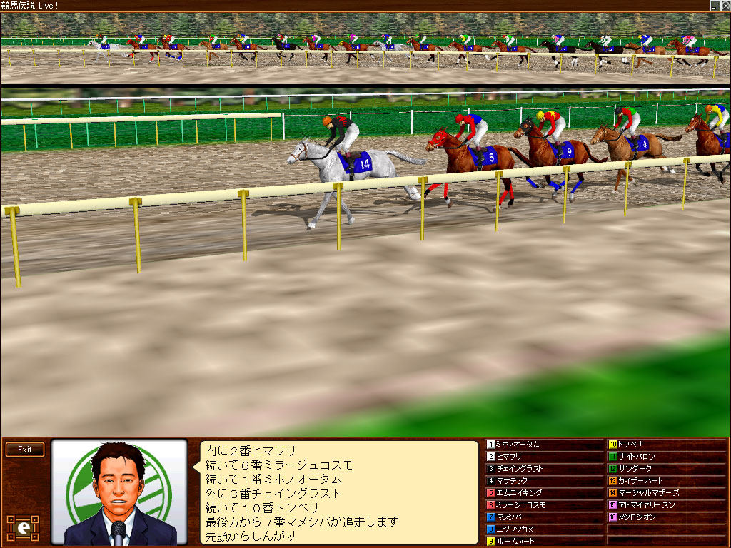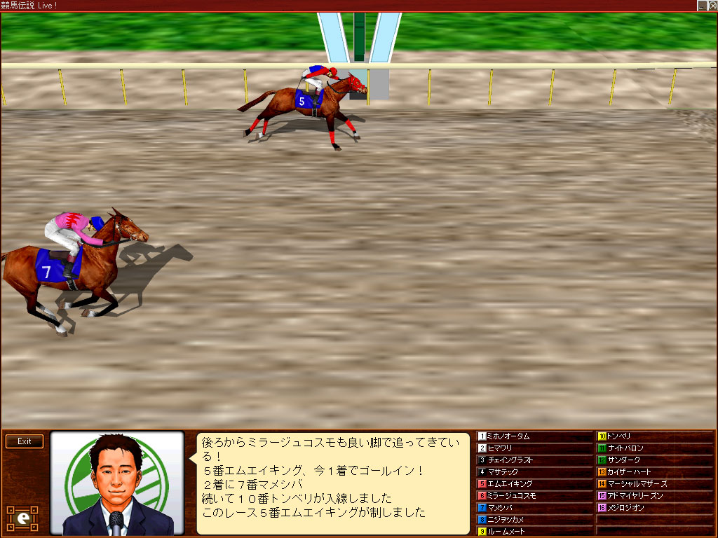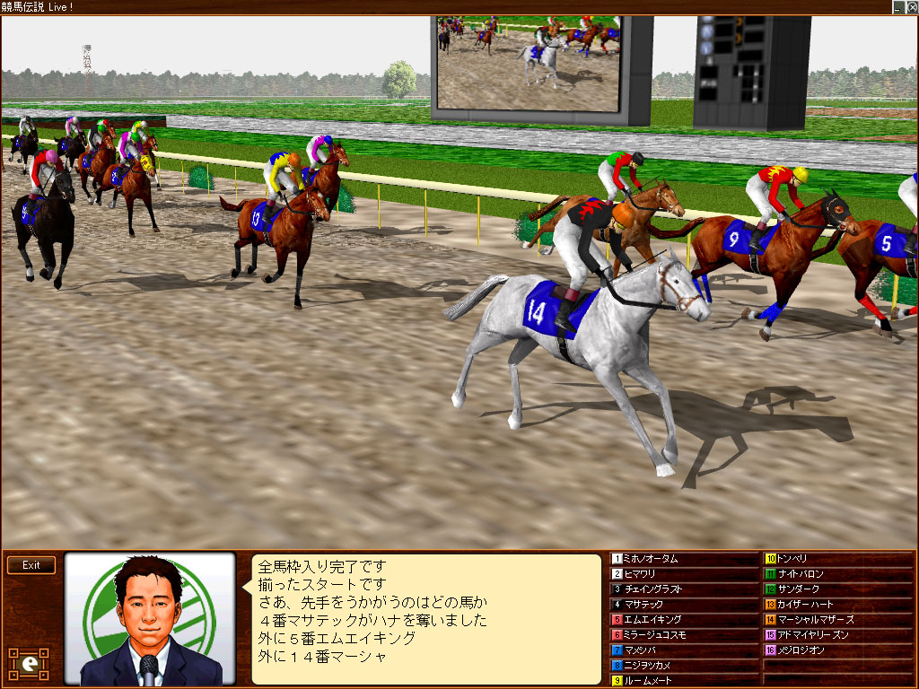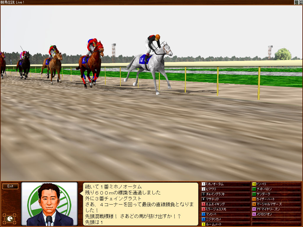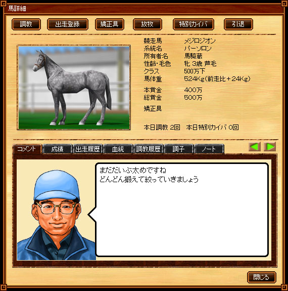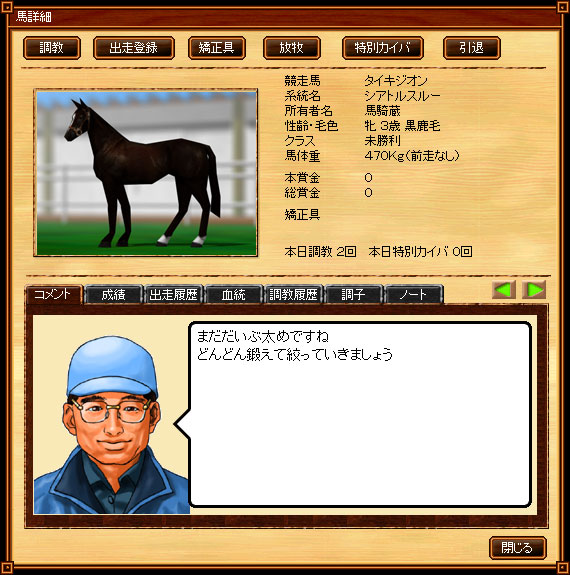 てなわけで,残念ながら今週も馬騎蔵牧場が誇る2頭だけのジオン軍はお休みとなってしまった。なにしろ,レースに出すには太すぎ丸すぎタプタプしすぎ。まぁ登録して出走するだけならやってやれないことはないけれど,そんなつまんないことで大事な手駒を失う危険を冒してもねぇ。でも,じゃぁ何をネタにすればいいだろう? 馬を補充するのはやっちゃったし。前回試したように,この状態じゃフリー走行も悲惨な結果を残すのみ,うーん……。