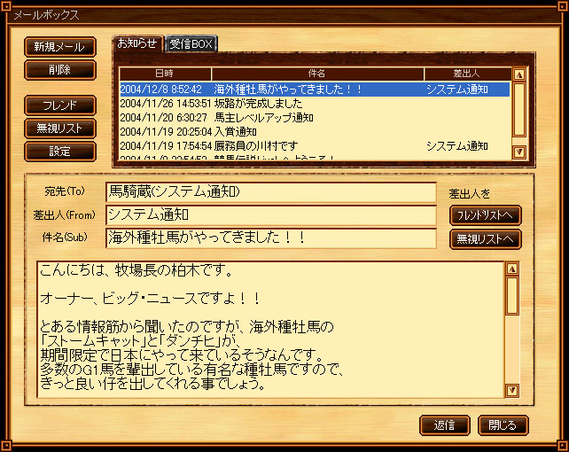ただし,幾つかの用語とか風習ってのがあるので,それを説明しよう。まず,母親のことは"繁殖牝馬"(はんしょくひんば)と呼ぶ。別に無理して呼ばなくてもいいけど,少なくとも世間ではそう呼ぶし,ゲーム中でもその名前で売られている。