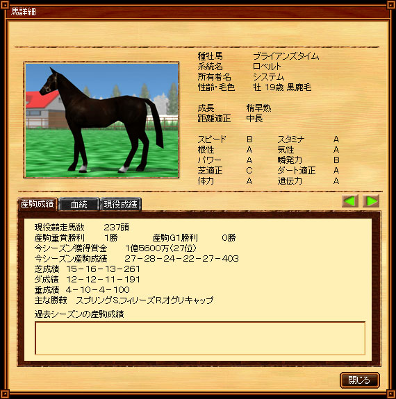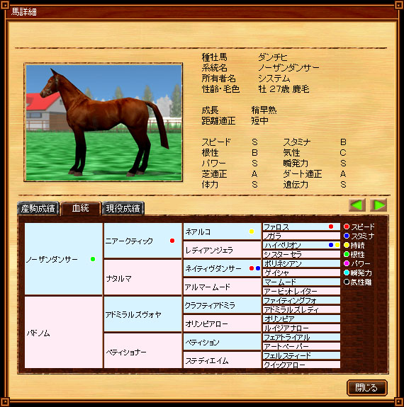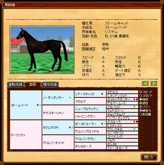 | 種牡馬 | スピード,スタミナ,根性,気性,パワー,瞬発力,芝適性,ダート適性,体力,遺伝力,成長,距離適性 |