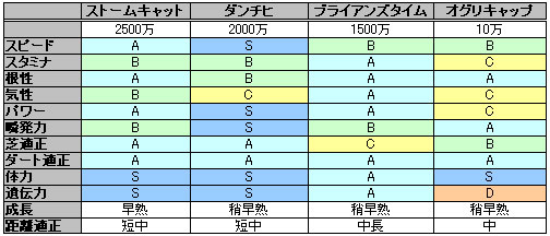 通常だと,種牡馬には1500万と最高値のブライアンズタイムから,10万で最安値のオグリキャップまで多くの馬がずらりと並んでいる。今回の期間限定イベントは,それらに加えて,海外種牡馬である"ストームキャット"と"ダンチヒ"の2頭が利用可能になるというもの。値段はそれぞれ2500万,2000万と半端ないが,十二分にそれに見合った能力だ。詳しくは次の表を見てほしい。