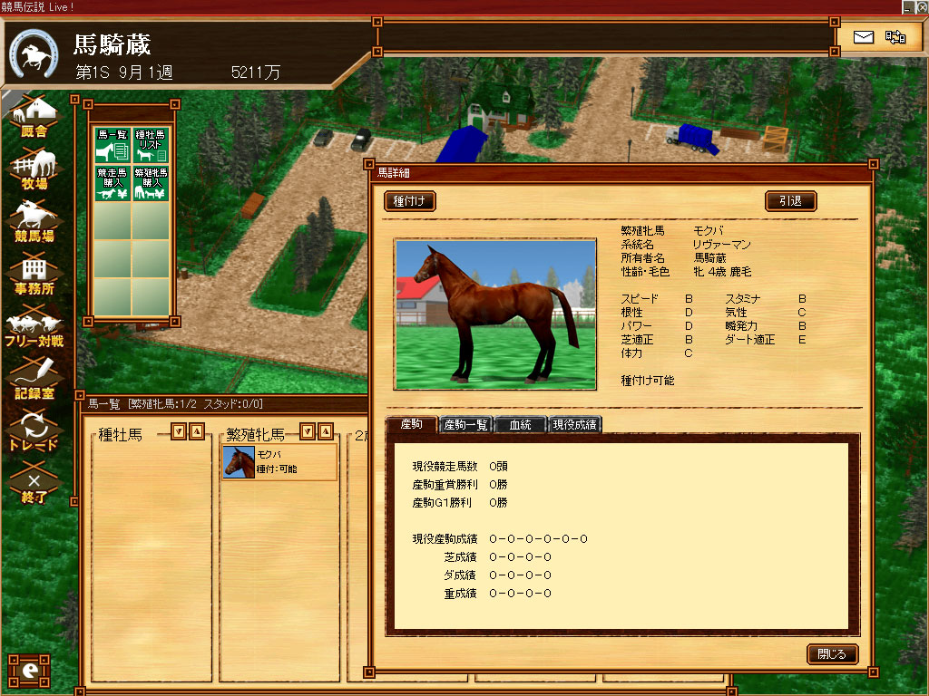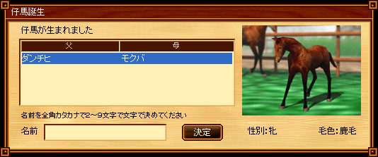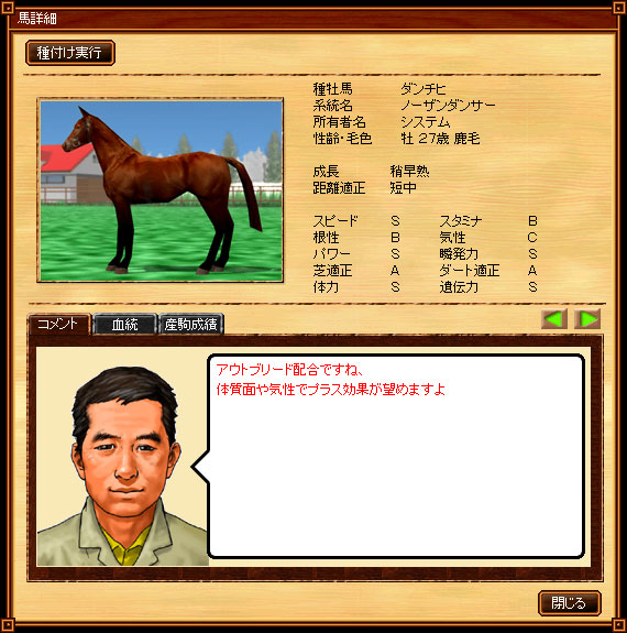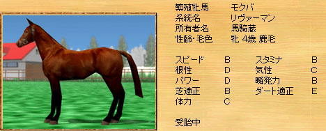 結果から言ってしまうと,子作りは大成功のうちに終わった。予算の都合により,残念ながらインブリードやらアウトブリードやらニックスやらを熱く語るような子作りはできなかったけど,ダンチヒは頑張り,母馬であるモクバに無事ダンチジオンの種を植え付けたのである。