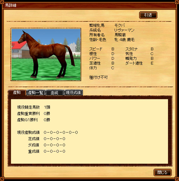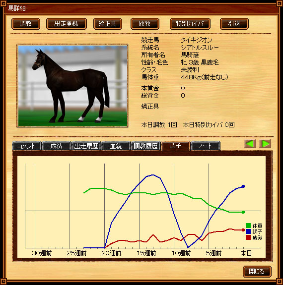 わずか1週間で2歳馬を産んだ奇蹟の馬。ならばすぐさま次の種付け! なんて思ったものの,それはさすがに無理難題。よく見ると,小さく可愛くこっそりと間違い探しかと思うぐらいのサイズで「種付け不可」と書かれているのです。無念。 しかし,予想外に大好調の大絶賛の大健闘。気が付けば我ら馬騎蔵牧場の三連星は,結構仕上がってきてたのだ。さぁご覧あれ。 |