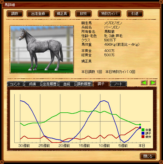 ただし,嬉しいことばかりでもない。とにもかくにも体重を減らさねばならなかったために行った毎週2回ずつの調教は,確実にそれぞれの馬の疲労度を高めてしまっている。あまり無理が続くようだと,ベストのレースもできないだろうし,それ以前に馬の体が心配だ。無事これ名馬,という言葉があるように,ちょっとぐらい遅くてもいいから無事に競走馬生活を終えてほしいものである。そこで我が馬騎蔵牧場が取った方法論は,次のようなものだ。