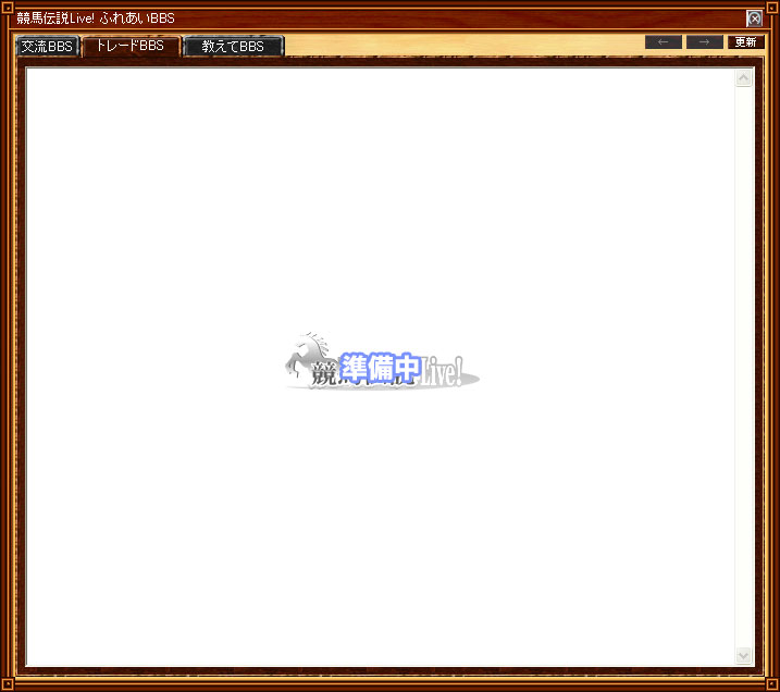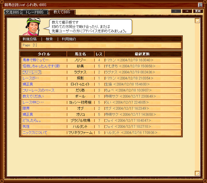 導入された掲示板は,「交流BBS」「トレードBBS」「教えてBBS」の3種類。現在のバージョンでは馬のトレードがまだできないため,「トレードBBS」は利用できない状態だが,ほかの二つはすでにガンガン利用されている。