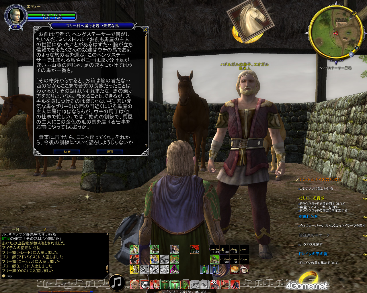 馬屋にいる,エオガルに「馬がほしい」って相談してみな。ただ,あそこはいつも人手不足で大変みたいだから,仕事を手伝わされるかもしれないね。オイラはエオガルんとこの馬を,ブリー村と大堀町,オスリカーの三か所に届ける仕事を手伝わされた。この仕事はとても簡単だよ。馬に乗って,届け先の馬屋まで行くだけなんだから。