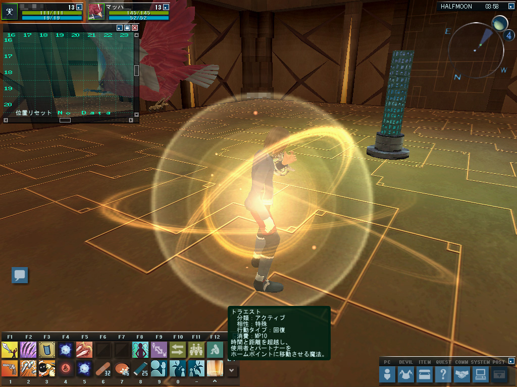 そういえば今回の攻略範囲にはまったく関係ないことだが,ホームポイントへ戻る魔法“トラエスト”はどうしてあんなに発動まで時間がかかるんだろうか。あまりにも時間がかかるため一度も詠唱完了までやったことがなかったのだが,モノは試し,この記事のネタにもなるだろうからと思い,一念発起,呪文を唱えてみたのだが……。想像以上に時間がかかった。この原稿のまとめメモをざっくりと書いて,煙草を2本吸って,母とリビングで会話して戻ってきても,まだ呪文詠唱中だったのだから。