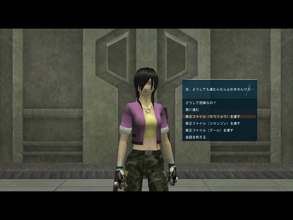 3種類の修正ファイルを,ボス部屋の扉の前に立つ女性に渡せば,渡した分だけザコ敵の数が減る |