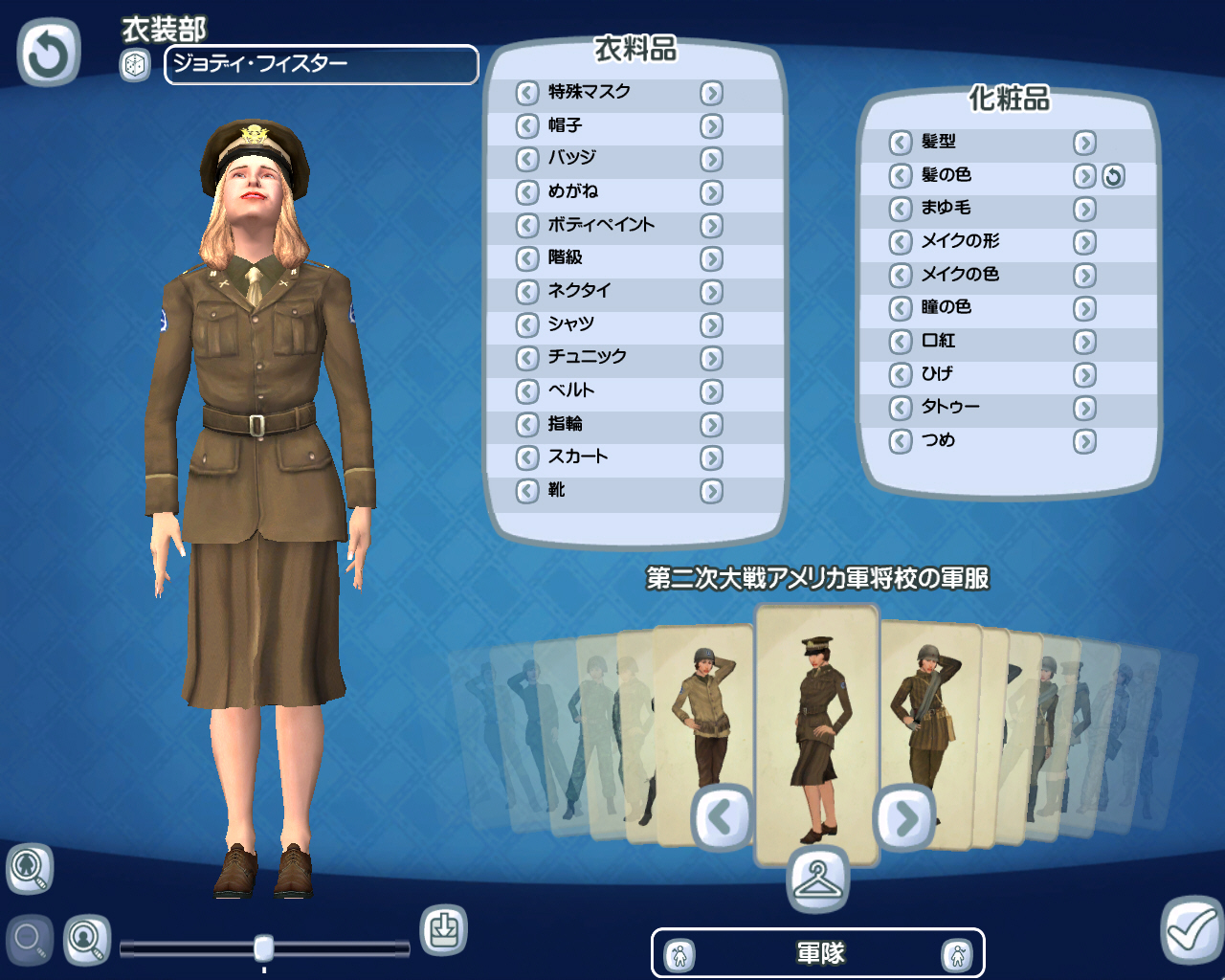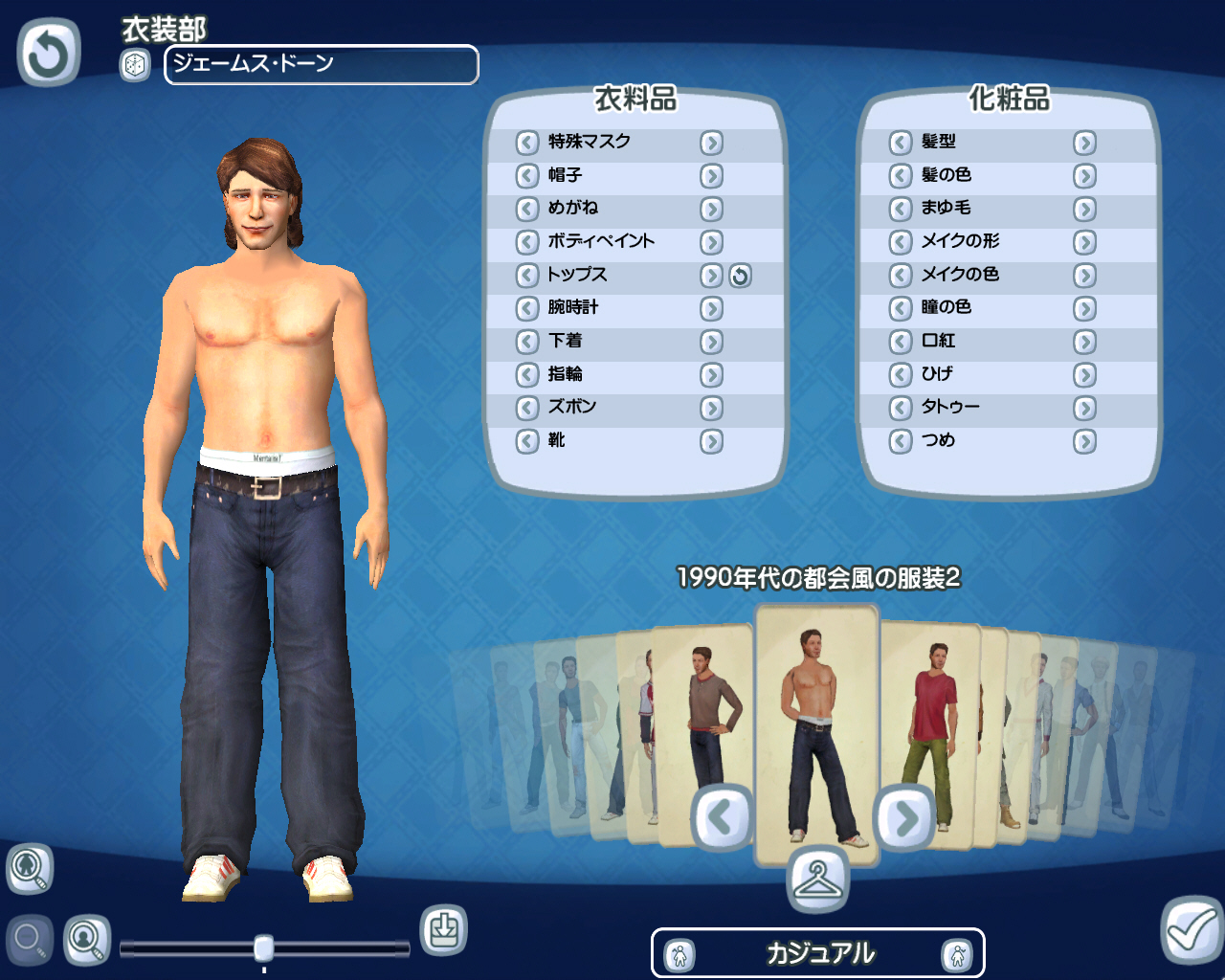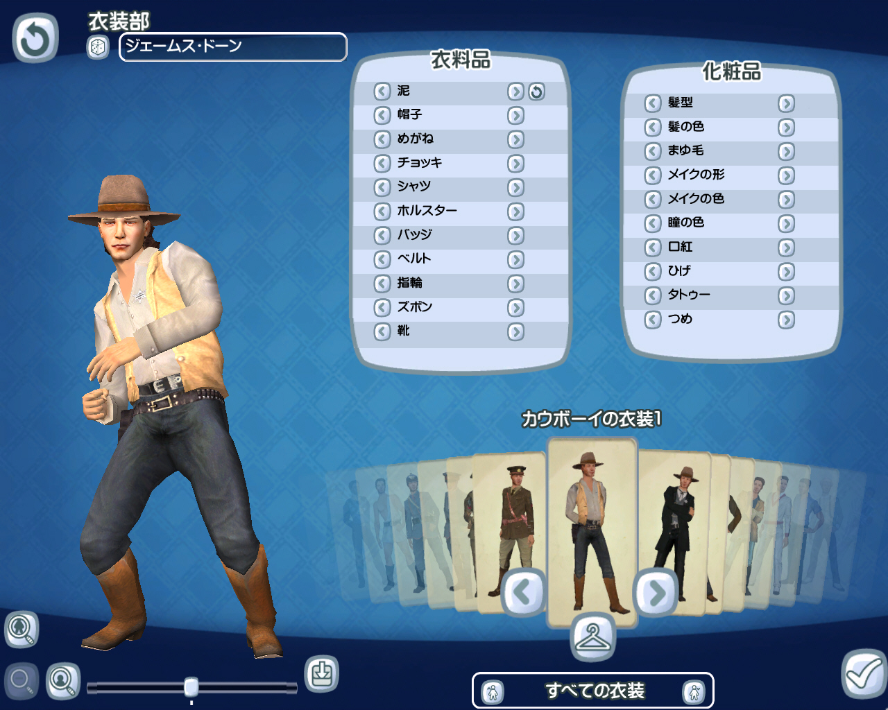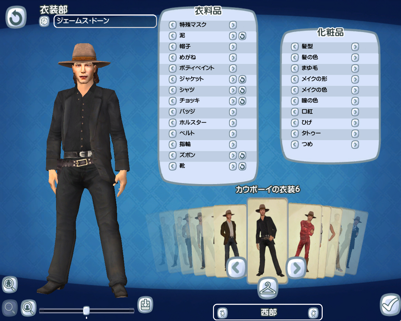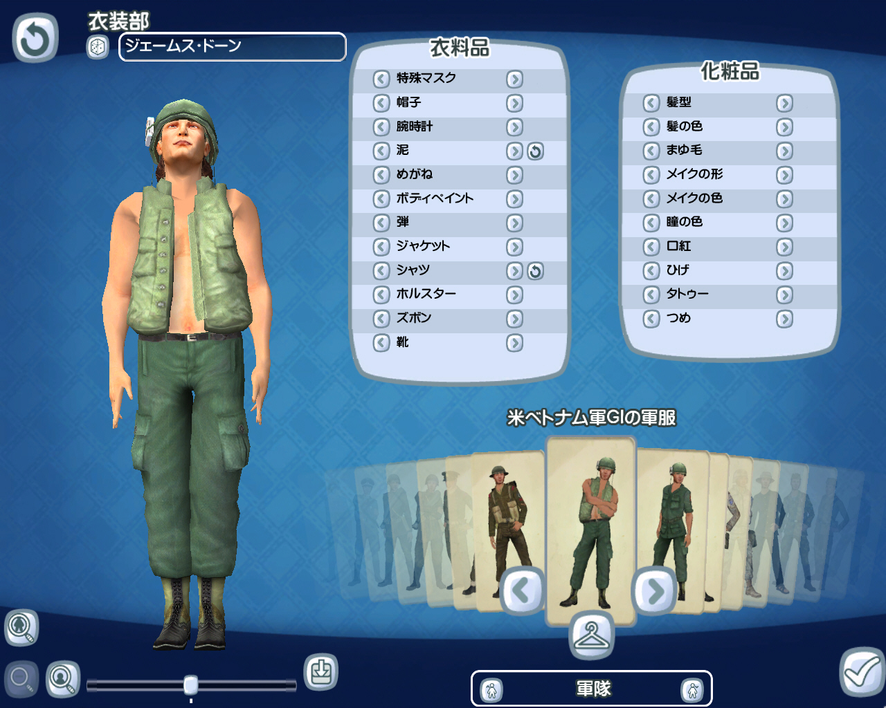 というわけで,うるさいスター達のために多くの衣装が用意されている本作だが,今回改めて収録衣装を数えてみると,シャレにならない数にのぼった。カジュアル,軍隊,西部など八つのカテゴリに分けられて,男女ごとに用意された衣装は何と250種類以上! さすがに全部並べて掲載するのは無茶なので,一部チョイスして紹介していく。実際には,この数倍は収録されているのだ。