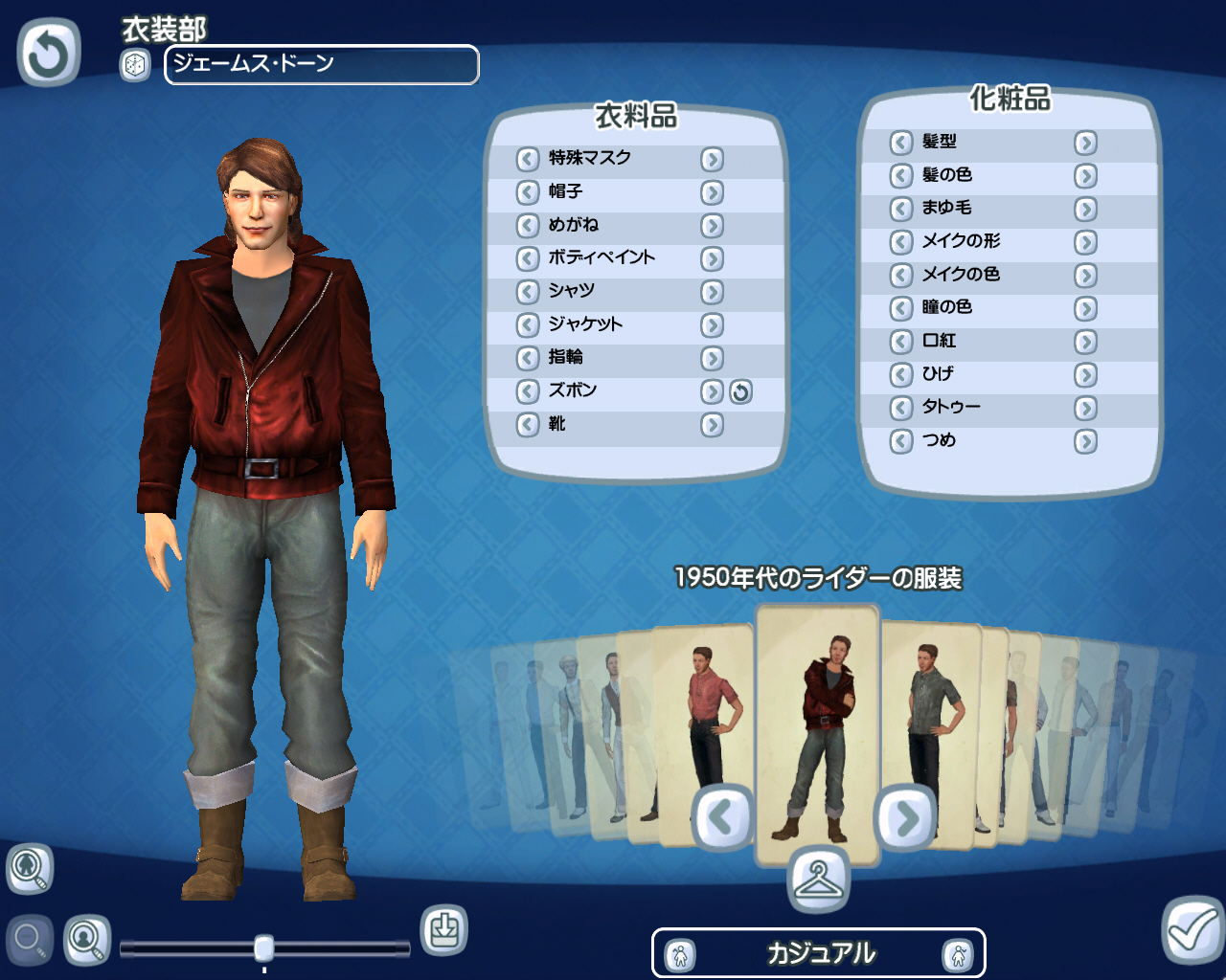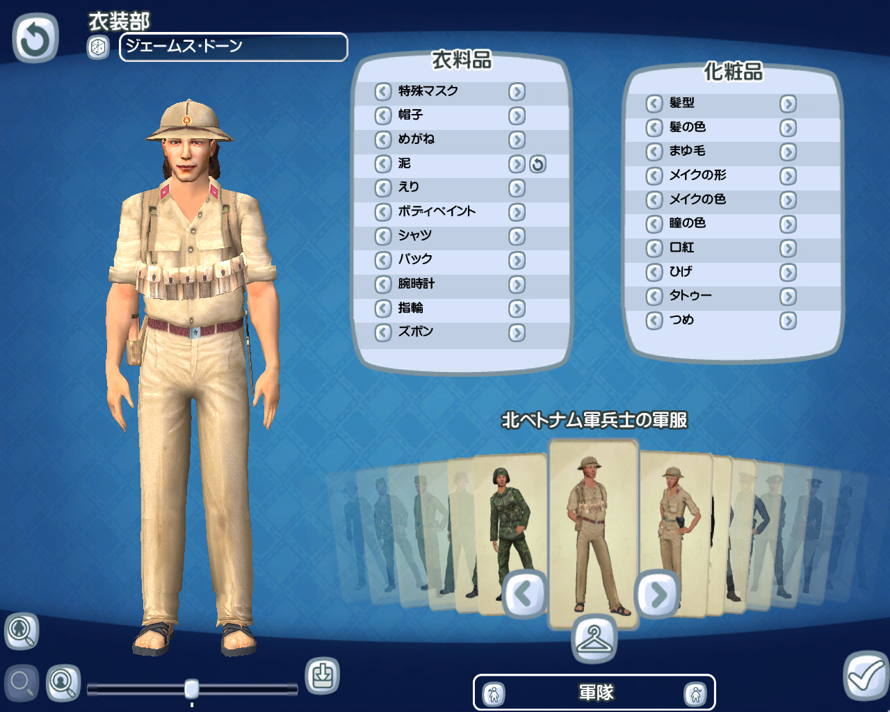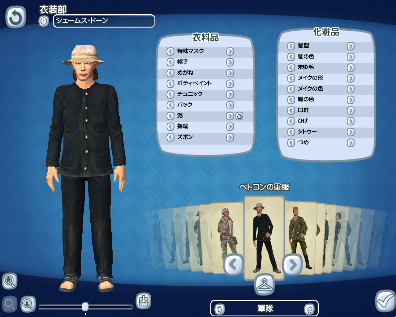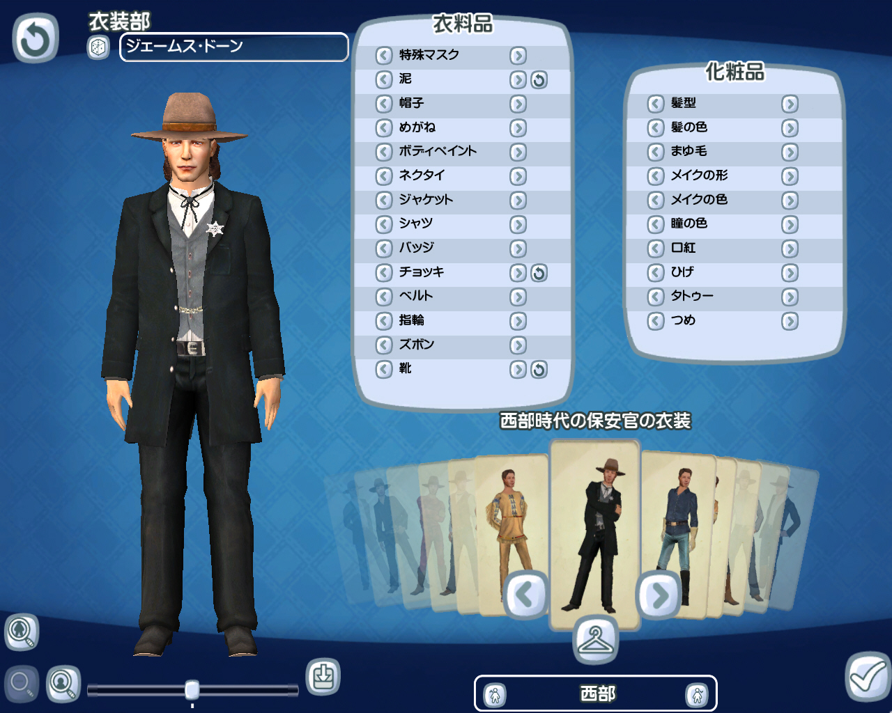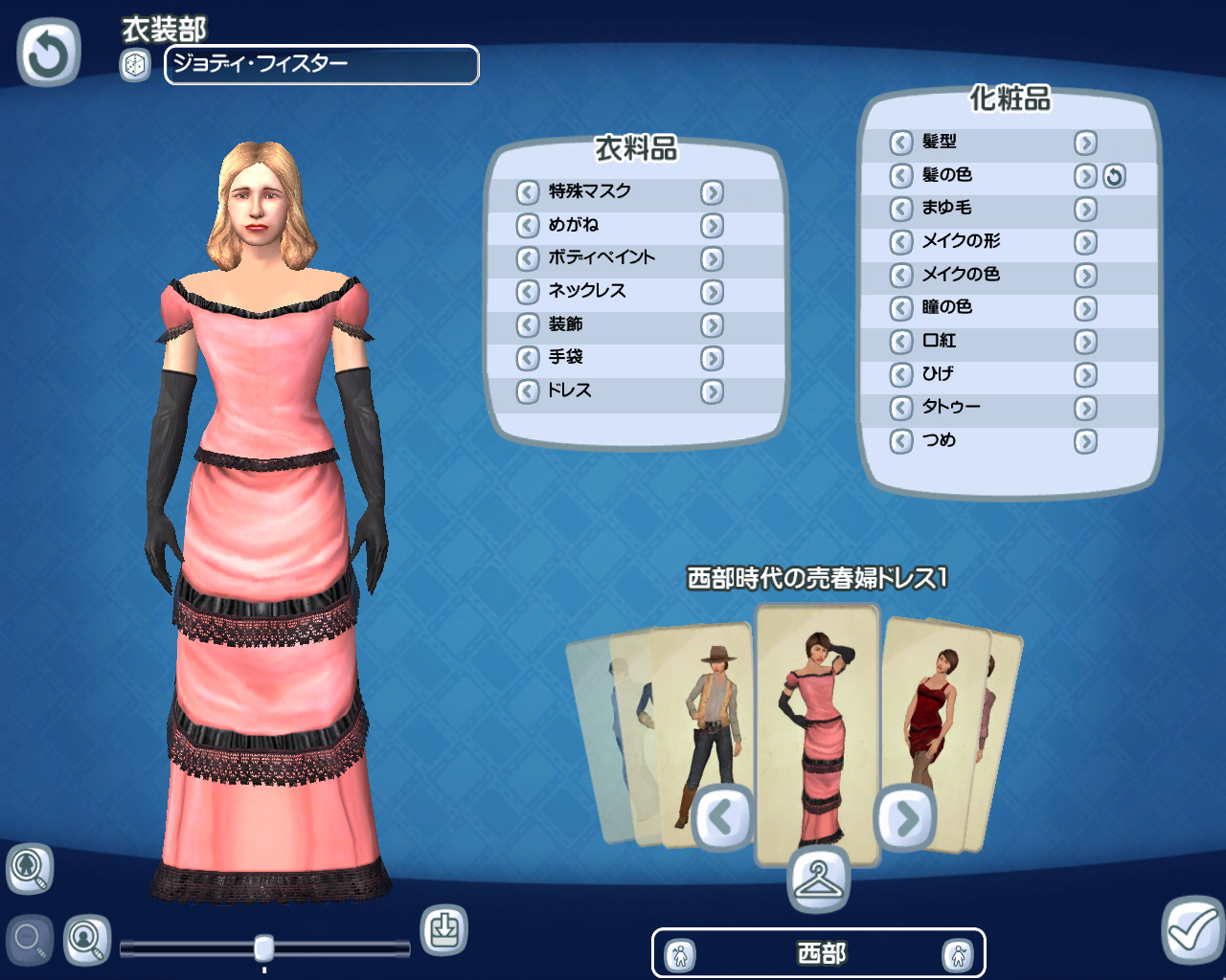 というわけで,うるさいスター達のために多くの衣装が用意されている本作だが,今回改めて収録衣装を数えてみると,シャレにならない数にのぼった。カジュアル,軍隊,西部など八つのカテゴリに分けられて,男女ごとに用意された衣装は何と250種類以上! さすがに全部並べて掲載するのは無茶なので,一部チョイスして紹介していく。実際には,この数倍は収録されているのだ。