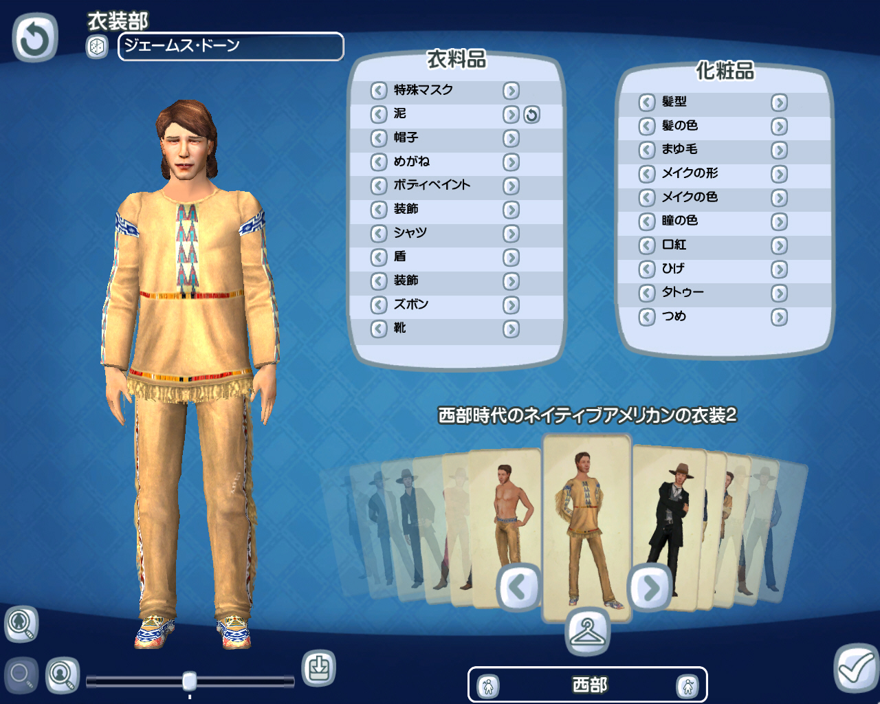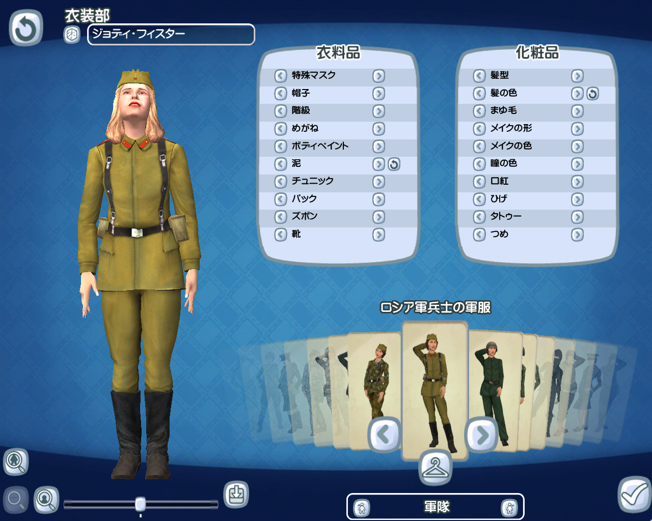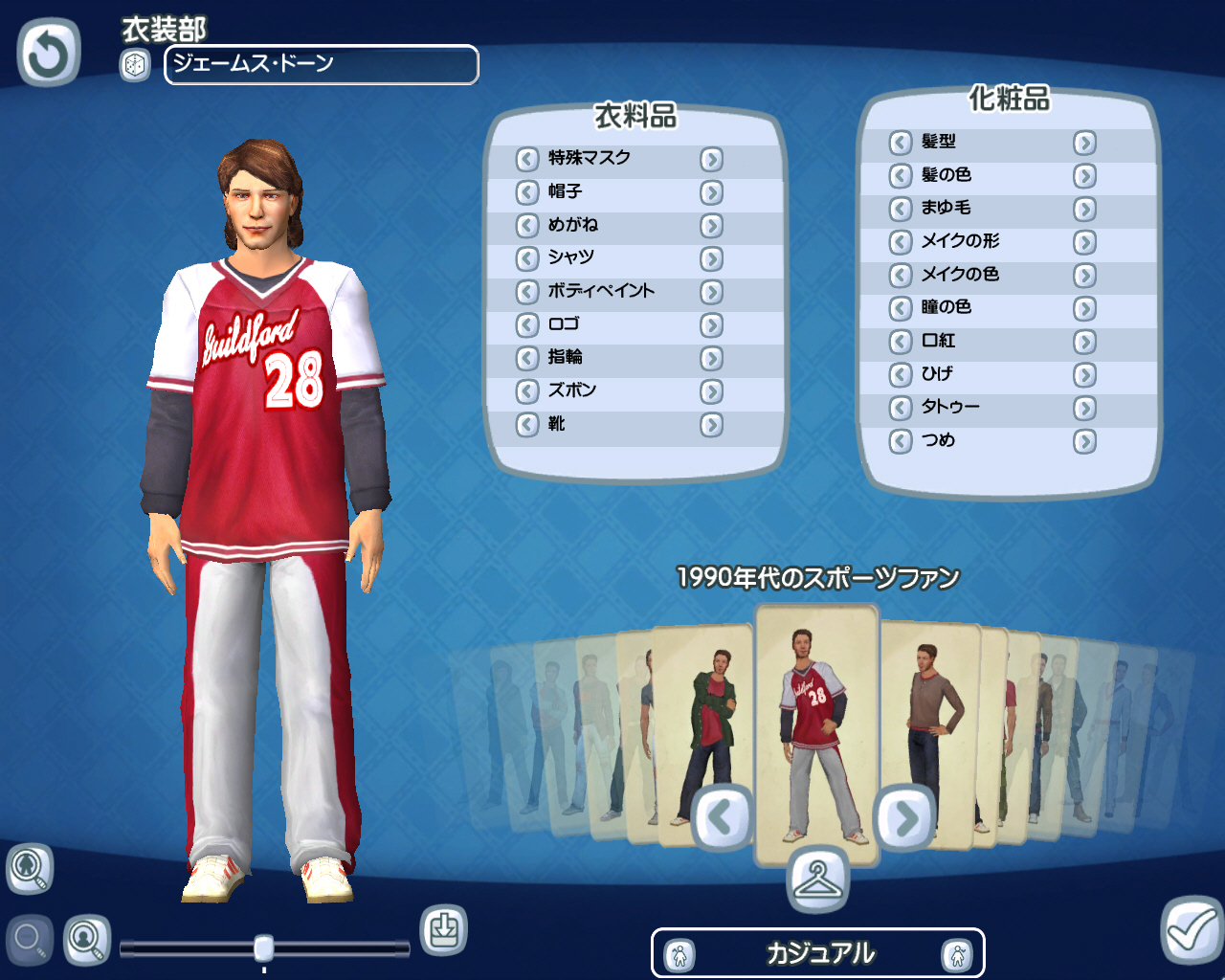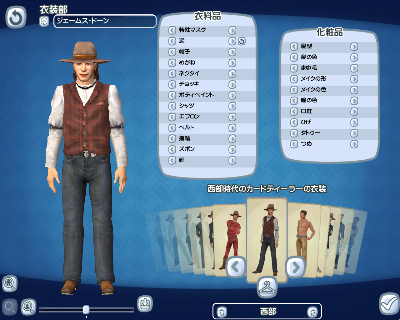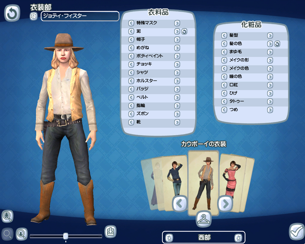 というわけで,うるさいスター達のために多くの衣装が用意されている本作だが,今回改めて収録衣装を数えてみると,シャレにならない数にのぼった。カジュアル,軍隊,西部など八つのカテゴリに分けられて,男女ごとに用意された衣装は何と250種類以上! さすがに全部並べて掲載するのは無茶なので,一部チョイスして紹介していく。実際には,この数倍は収録されているのだ。