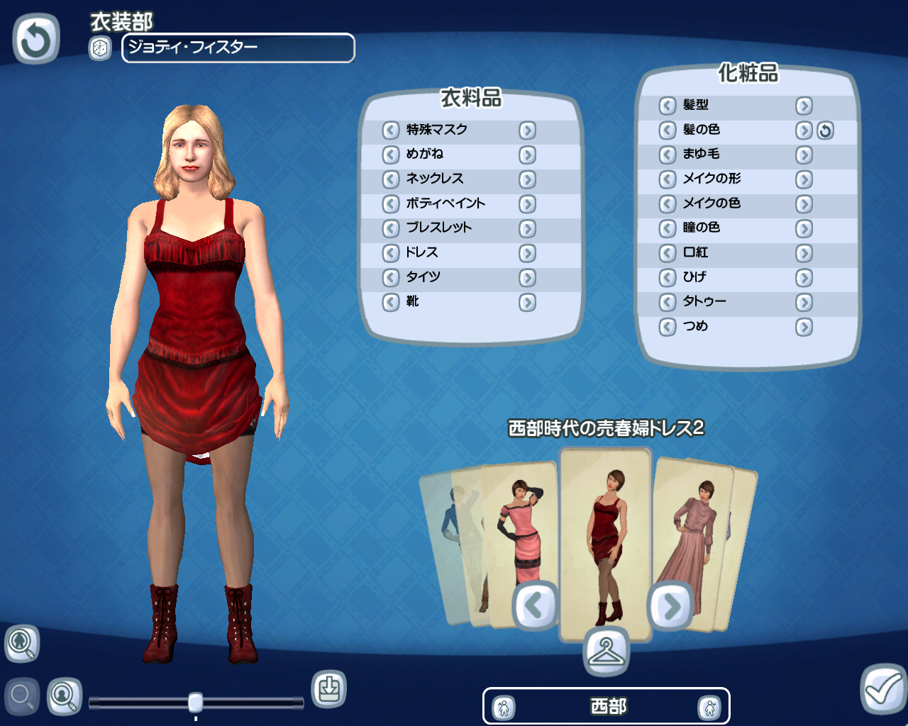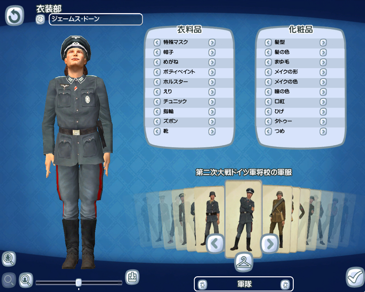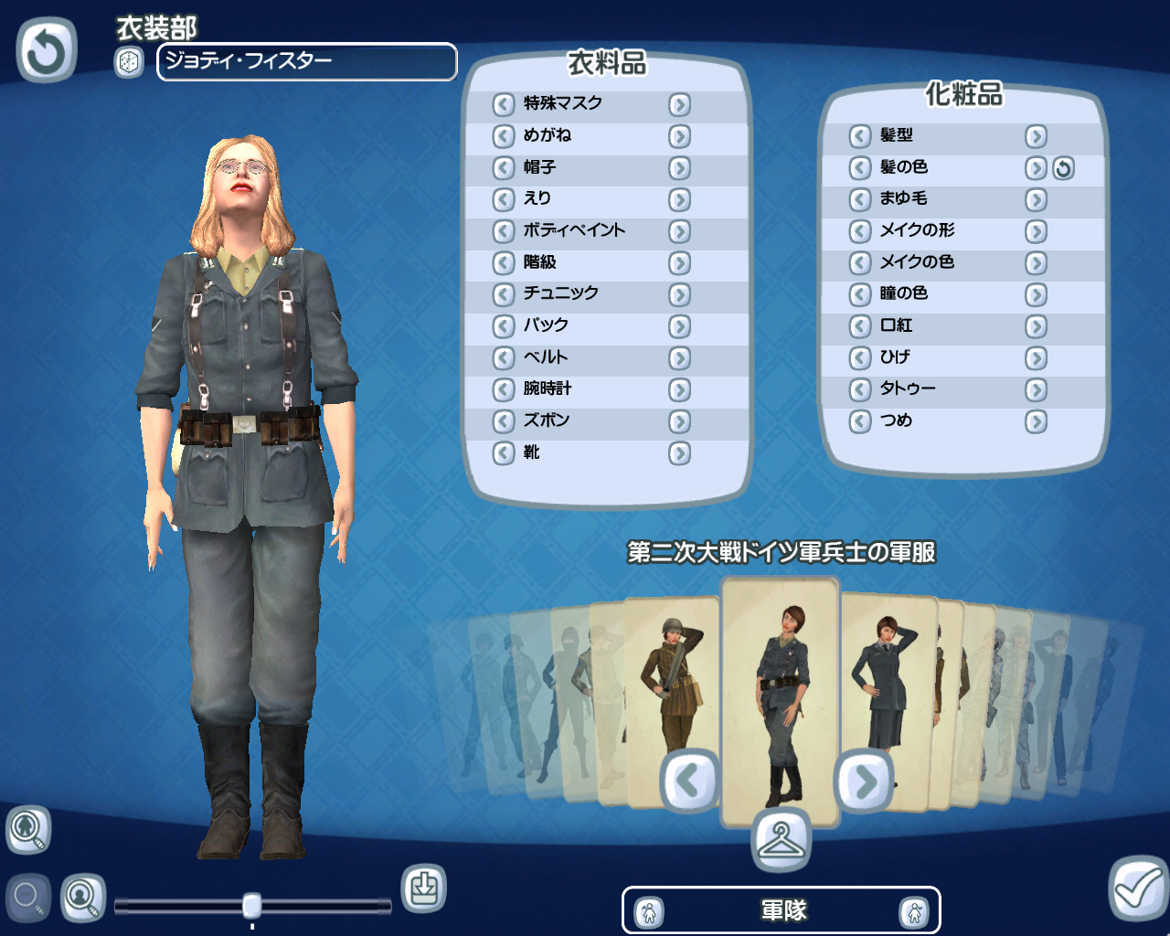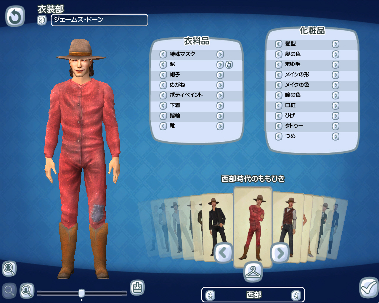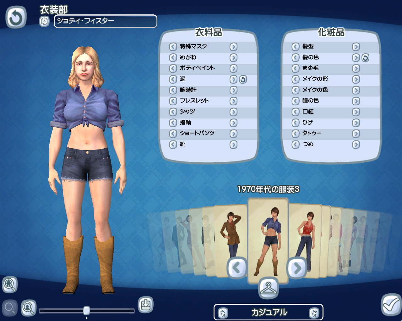 というわけで,うるさいスター達のために多くの衣装が用意されている本作だが,今回改めて収録衣装を数えてみると,シャレにならない数にのぼった。カジュアル,軍隊,西部など八つのカテゴリに分けられて,男女ごとに用意された衣装は何と250種類以上! さすがに全部並べて掲載するのは無茶なので,一部チョイスして紹介していく。実際には,この数倍は収録されているのだ。
