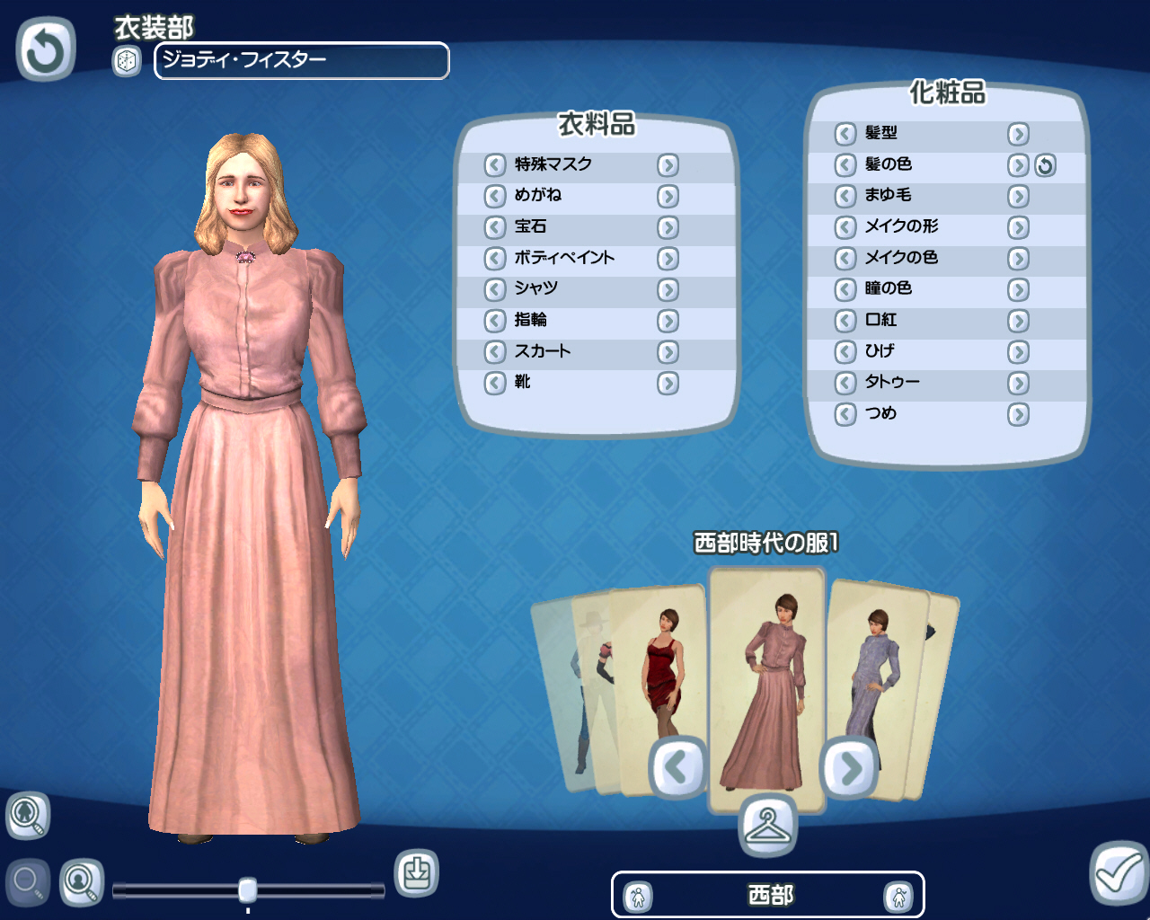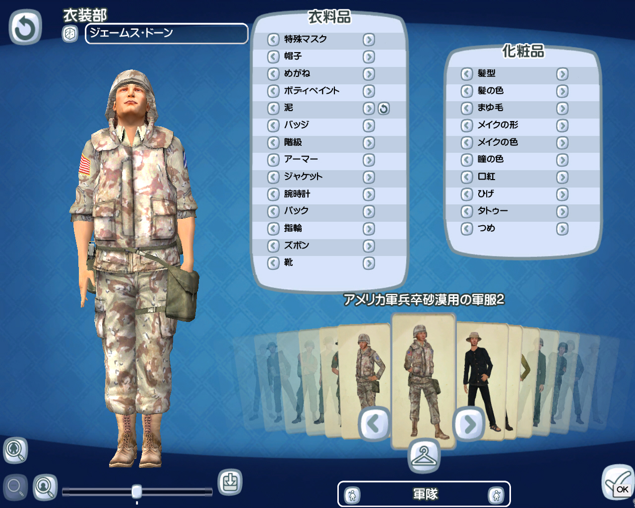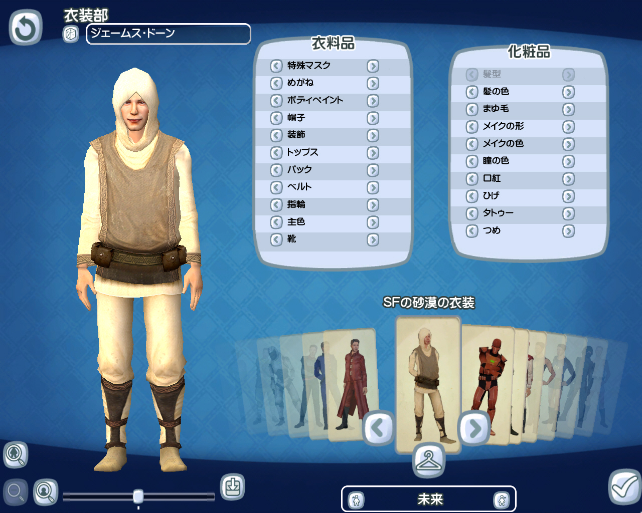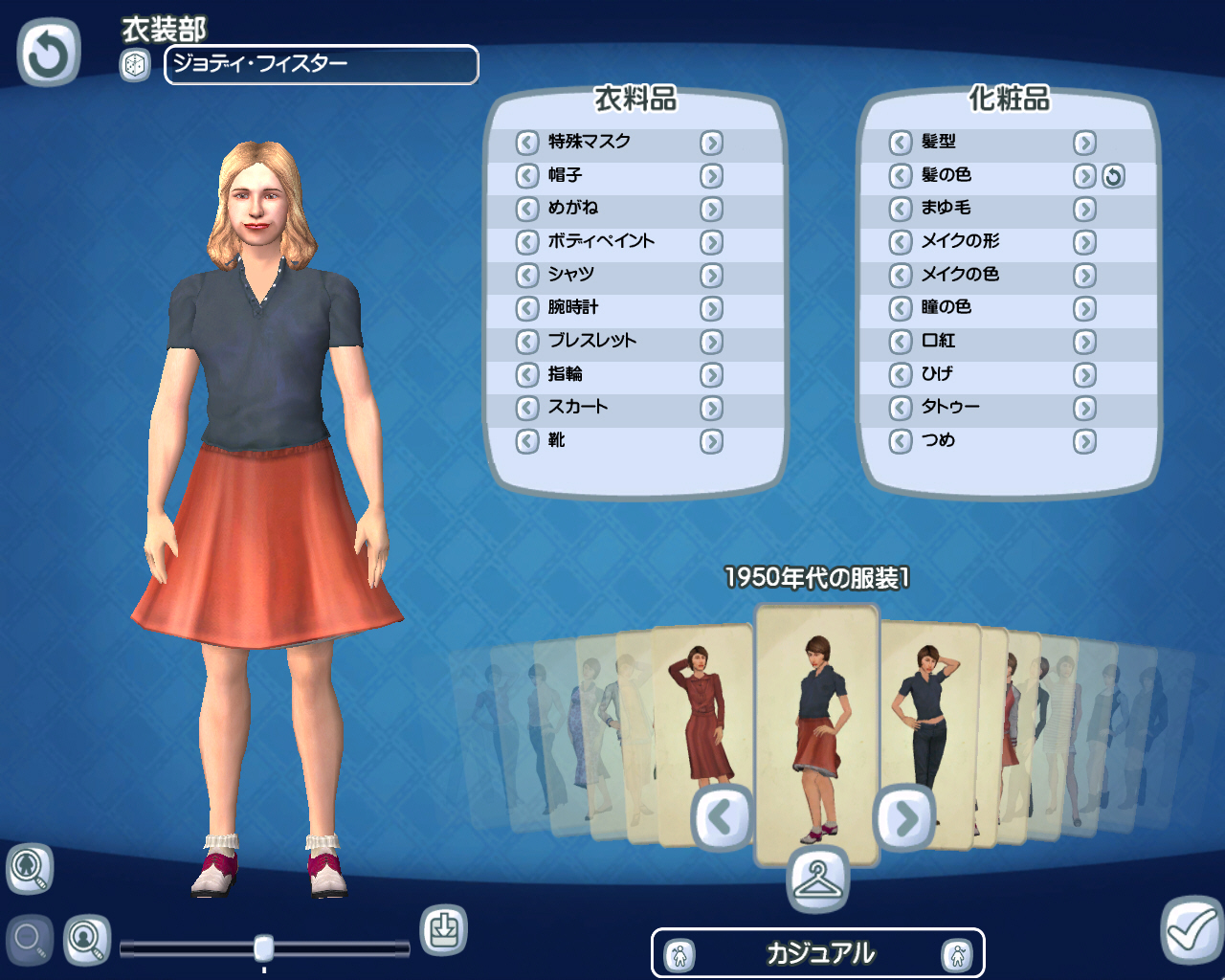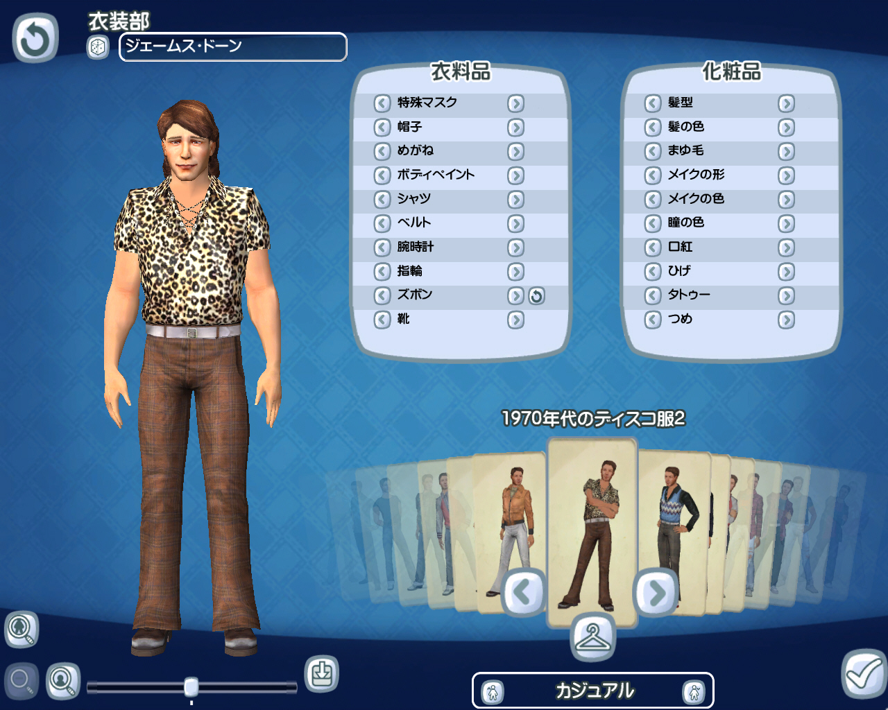 というわけで,うるさいスター達のために多くの衣装が用意されている本作だが,今回改めて収録衣装を数えてみると,シャレにならない数にのぼった。カジュアル,軍隊,西部など八つのカテゴリに分けられて,男女ごとに用意された衣装は何と250種類以上! さすがに全部並べて掲載するのは無茶なので,一部チョイスして紹介していく。実際には,この数倍は収録されているのだ。
