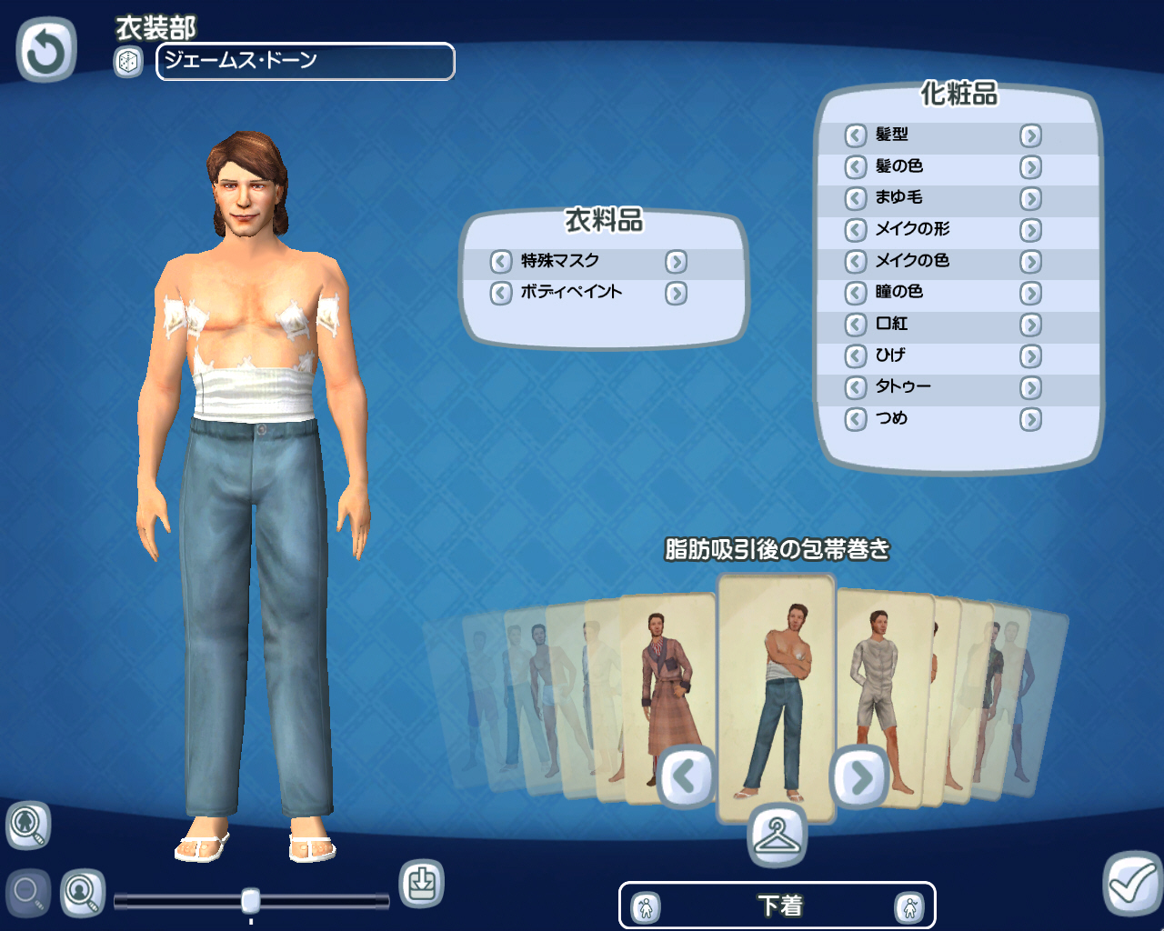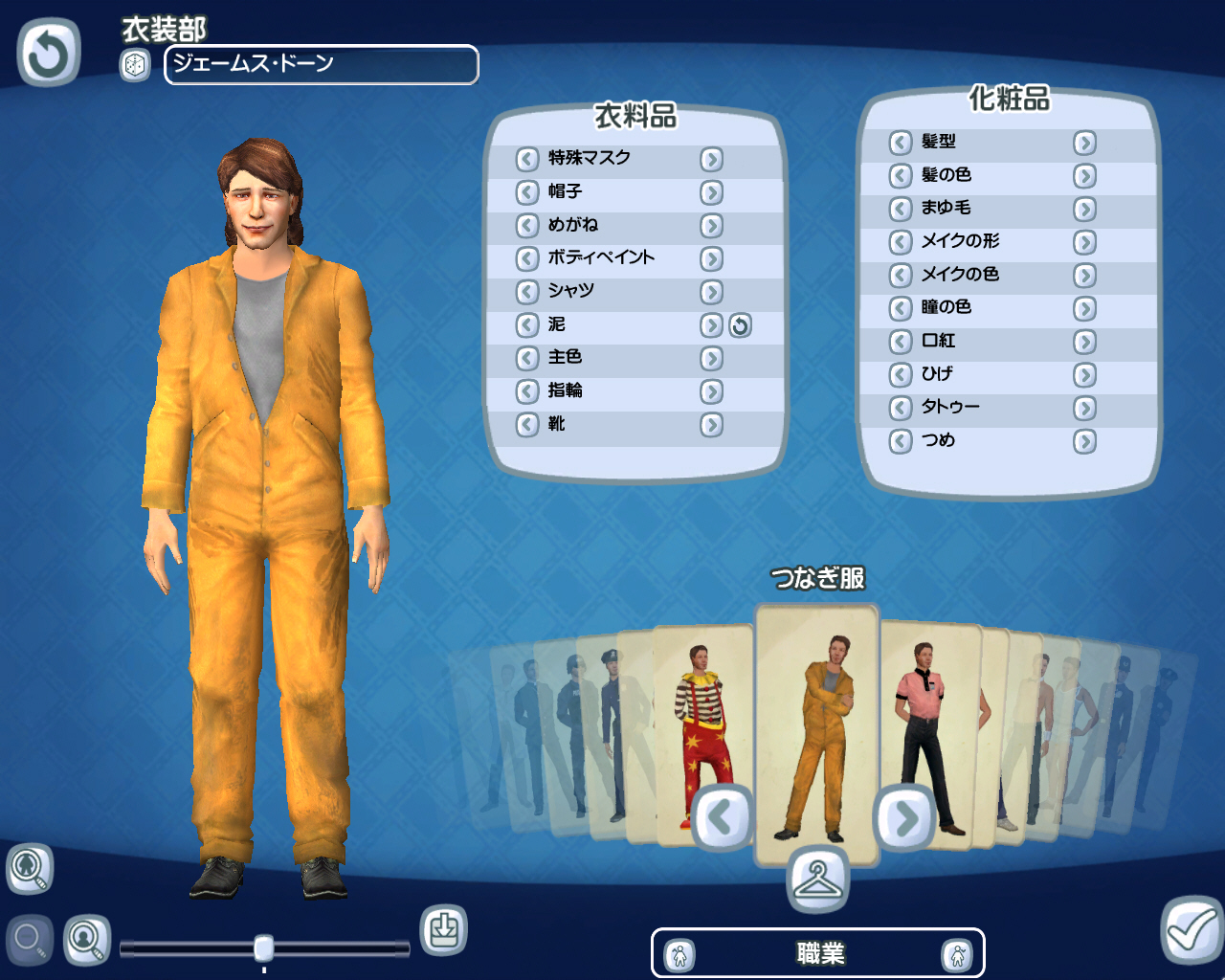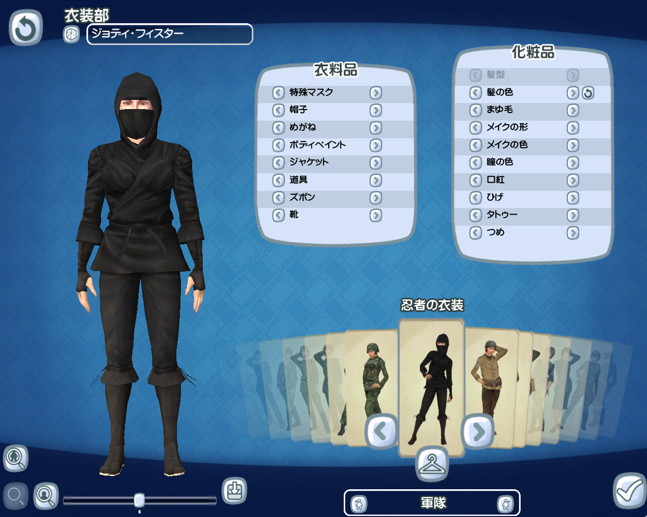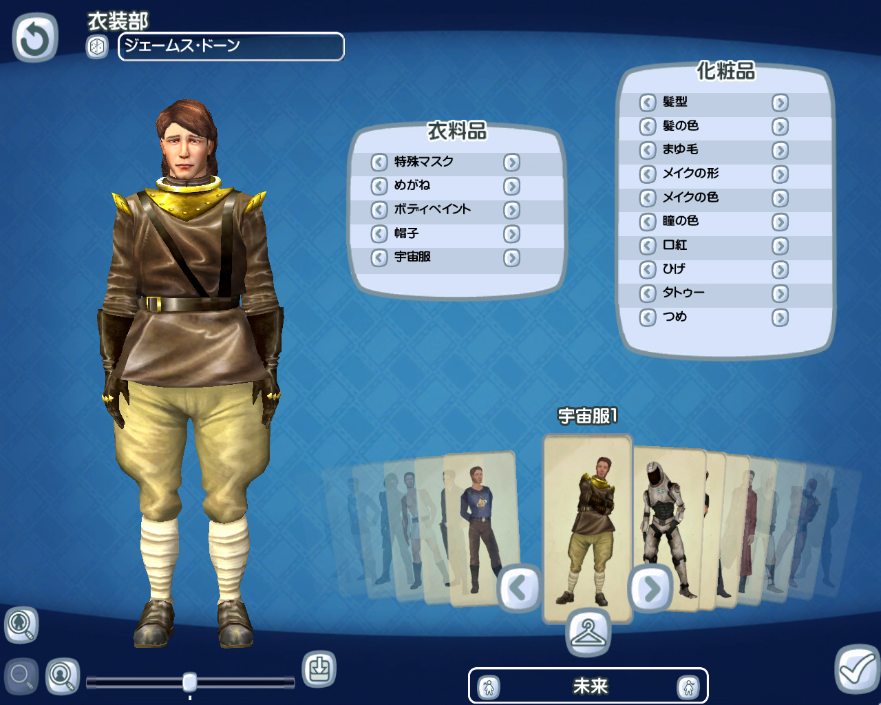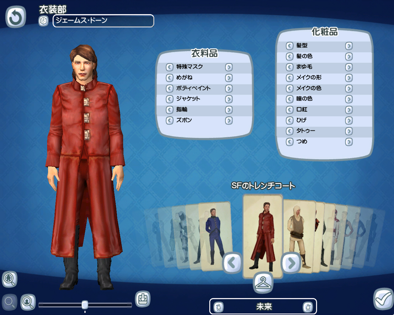 というわけで,うるさいスター達のために多くの衣装が用意されている本作だが,今回改めて収録衣装を数えてみると,シャレにならない数にのぼった。カジュアル,軍隊,西部など八つのカテゴリに分けられて,男女ごとに用意された衣装は何と250種類以上! さすがに全部並べて掲載するのは無茶なので,一部チョイスして紹介していく。実際には,この数倍は収録されているのだ。