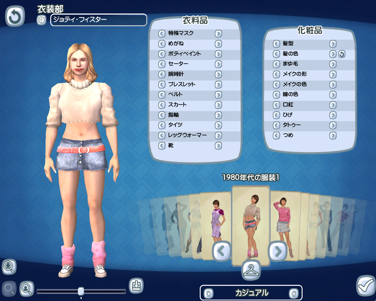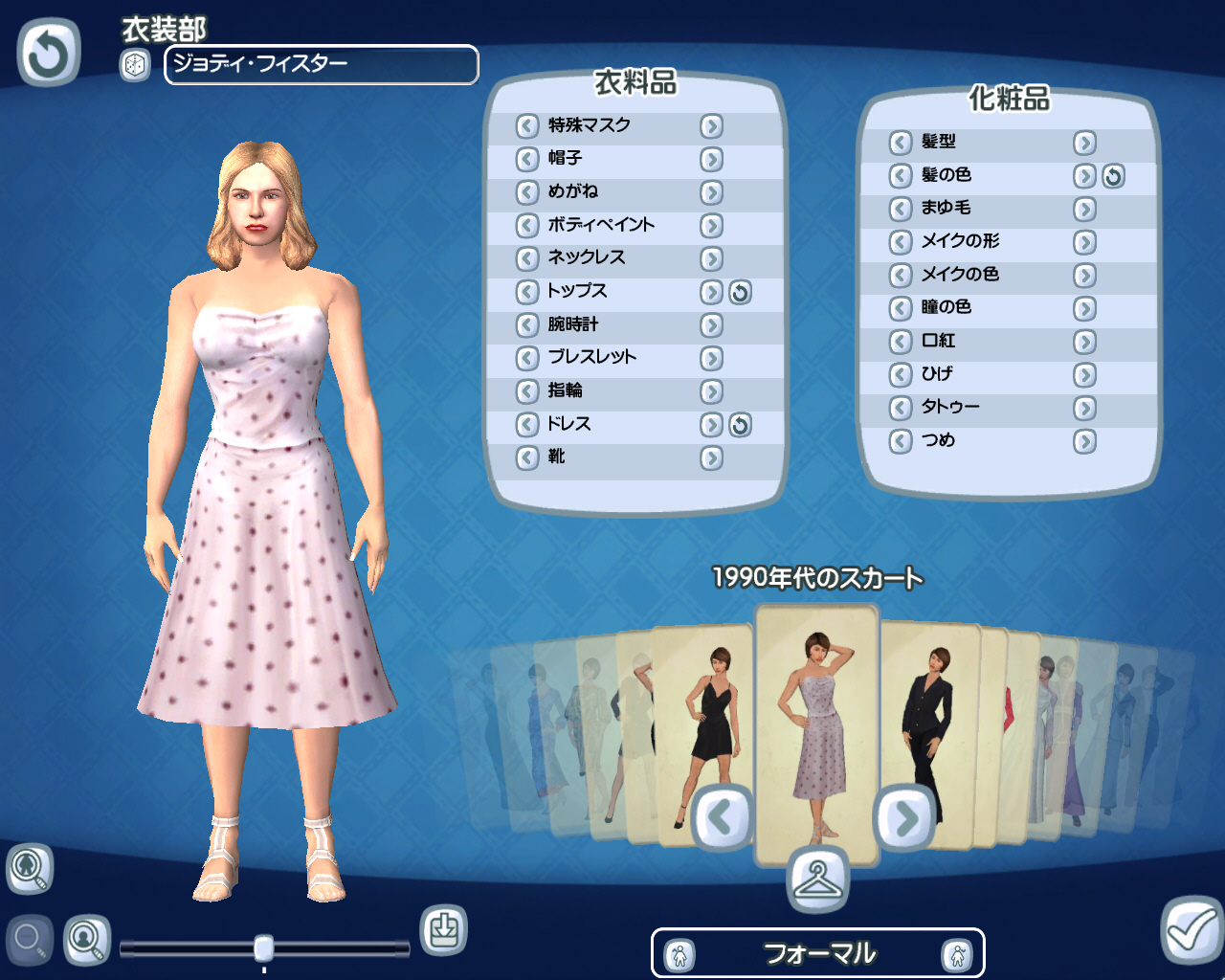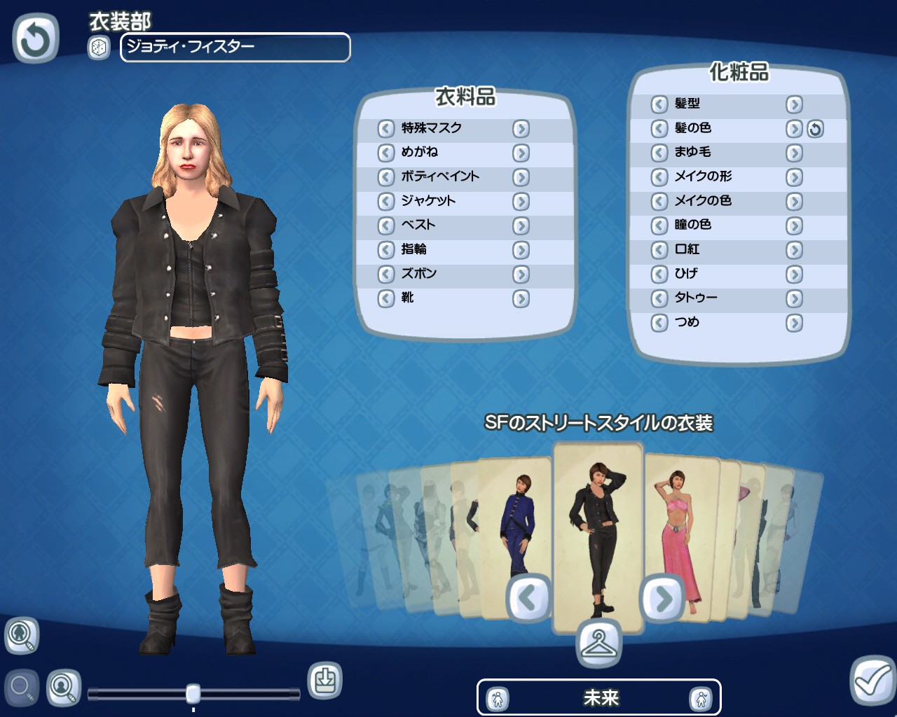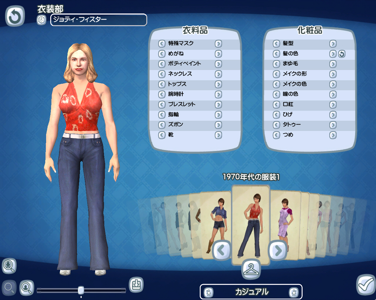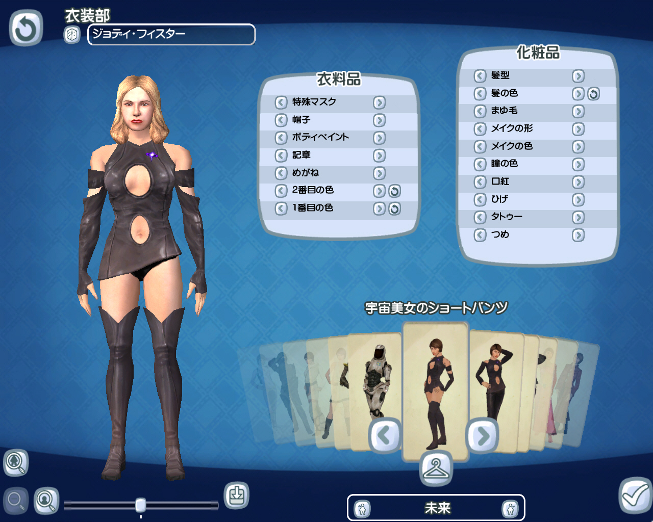 衣装は「カジュアル」「フォーマル」「下着」「職業」「軍隊」「西部」「未来」「モンスター」のカテゴリに分類され,ほとんどの衣装で複数のカラーやデザインが用意されている。また,衣装に合わせた靴やアクセサリの追加,髪型,メイクの変更などもできるので,スター達を着飾ってやろう。