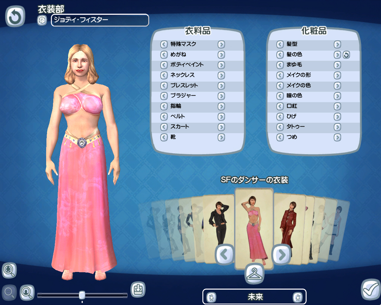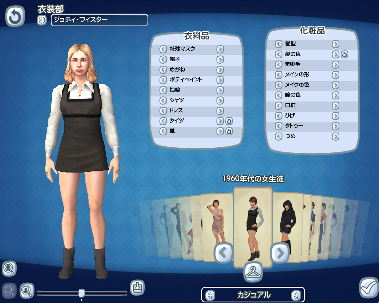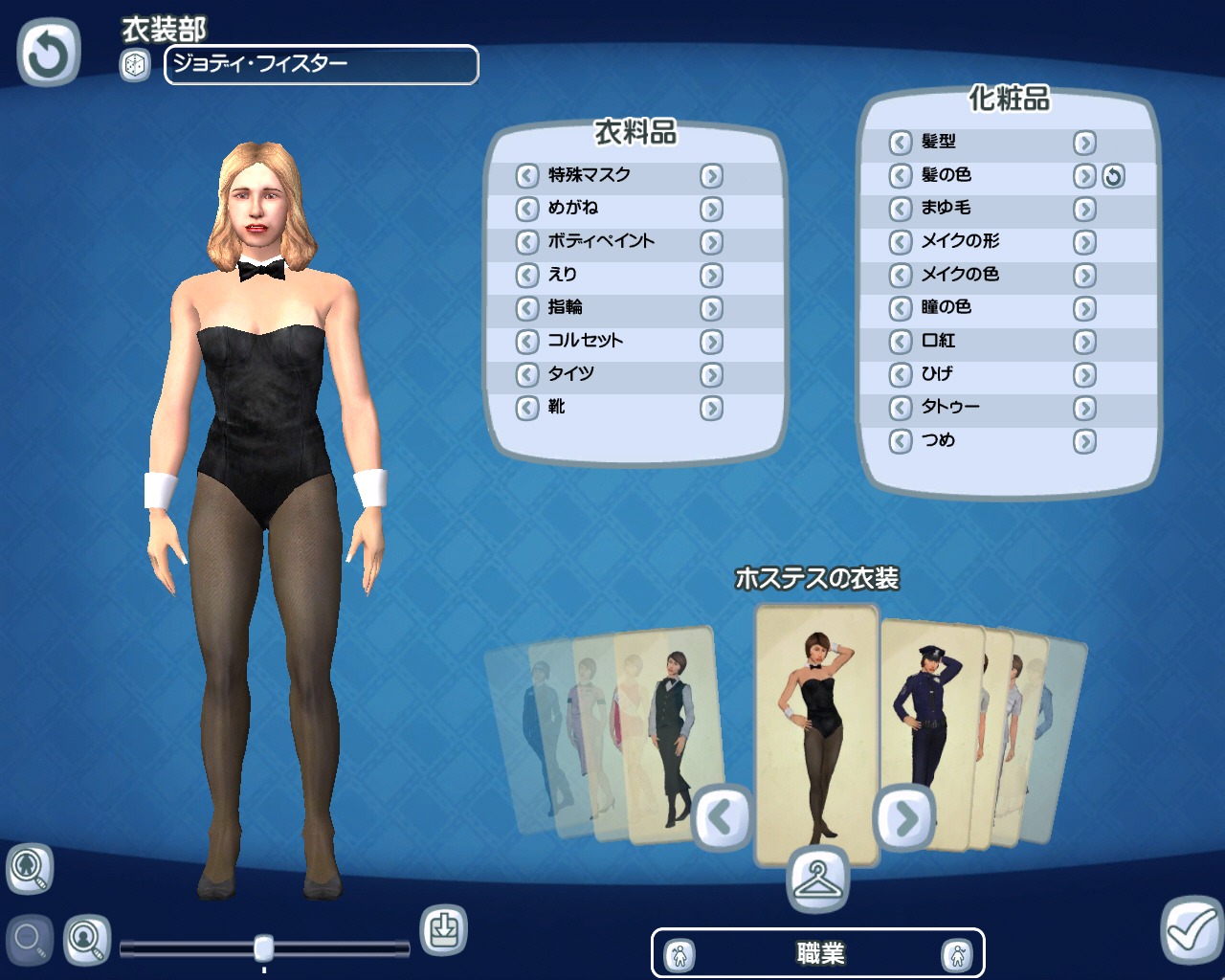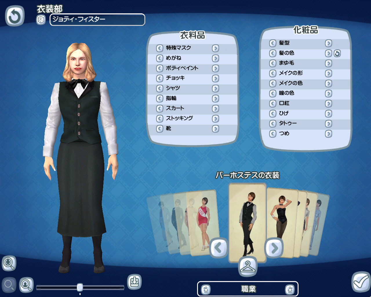 衣装は「カジュアル」「フォーマル」「下着」「職業」「軍隊」「西部」「未来」「モンスター」のカテゴリに分類され,ほとんどの衣装で複数のカラーやデザインが用意されている。また,衣装に合わせた靴やアクセサリの追加,髪型,メイクの変更などもできるので,スター達を着飾ってやろう。