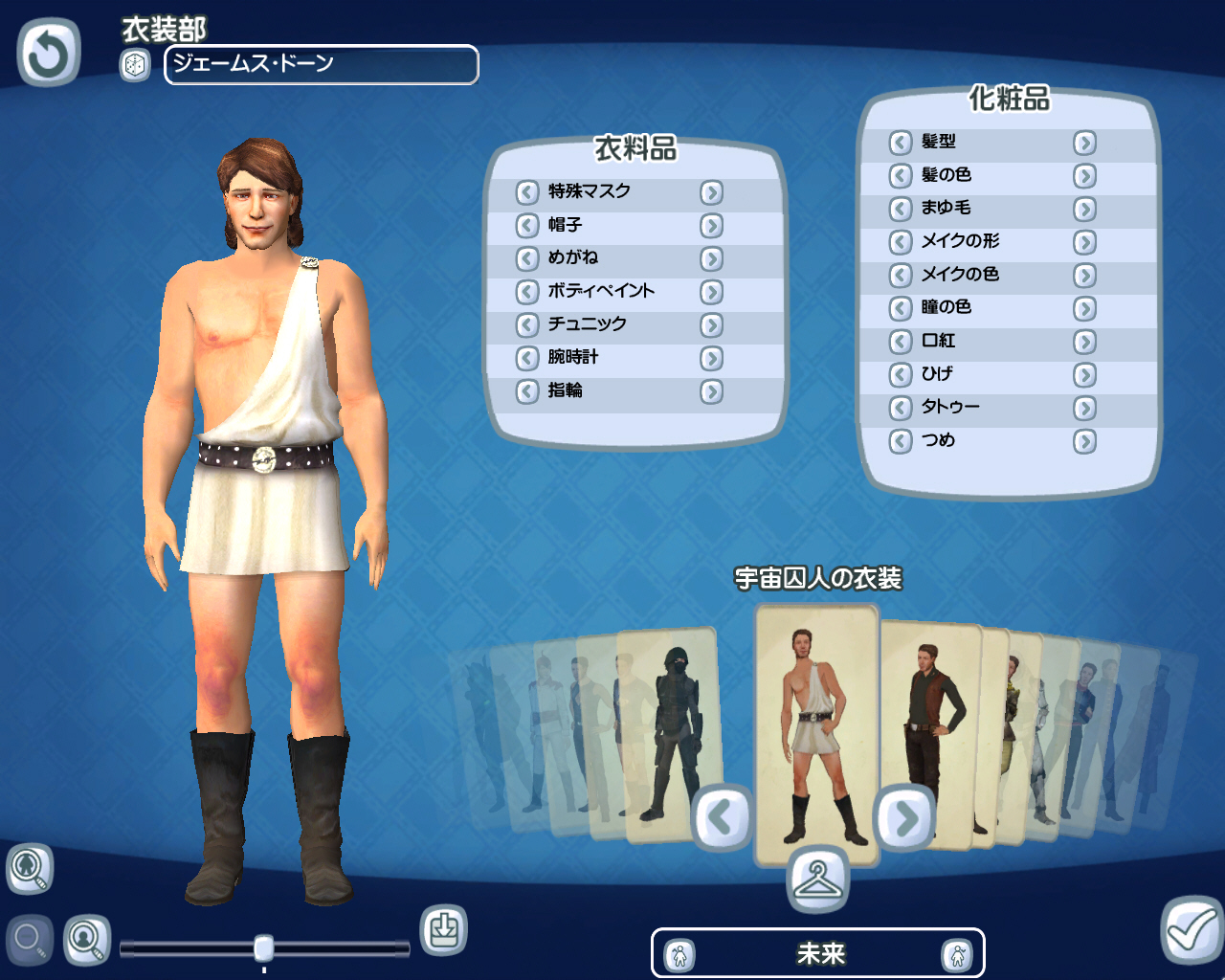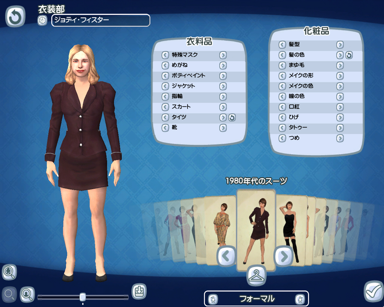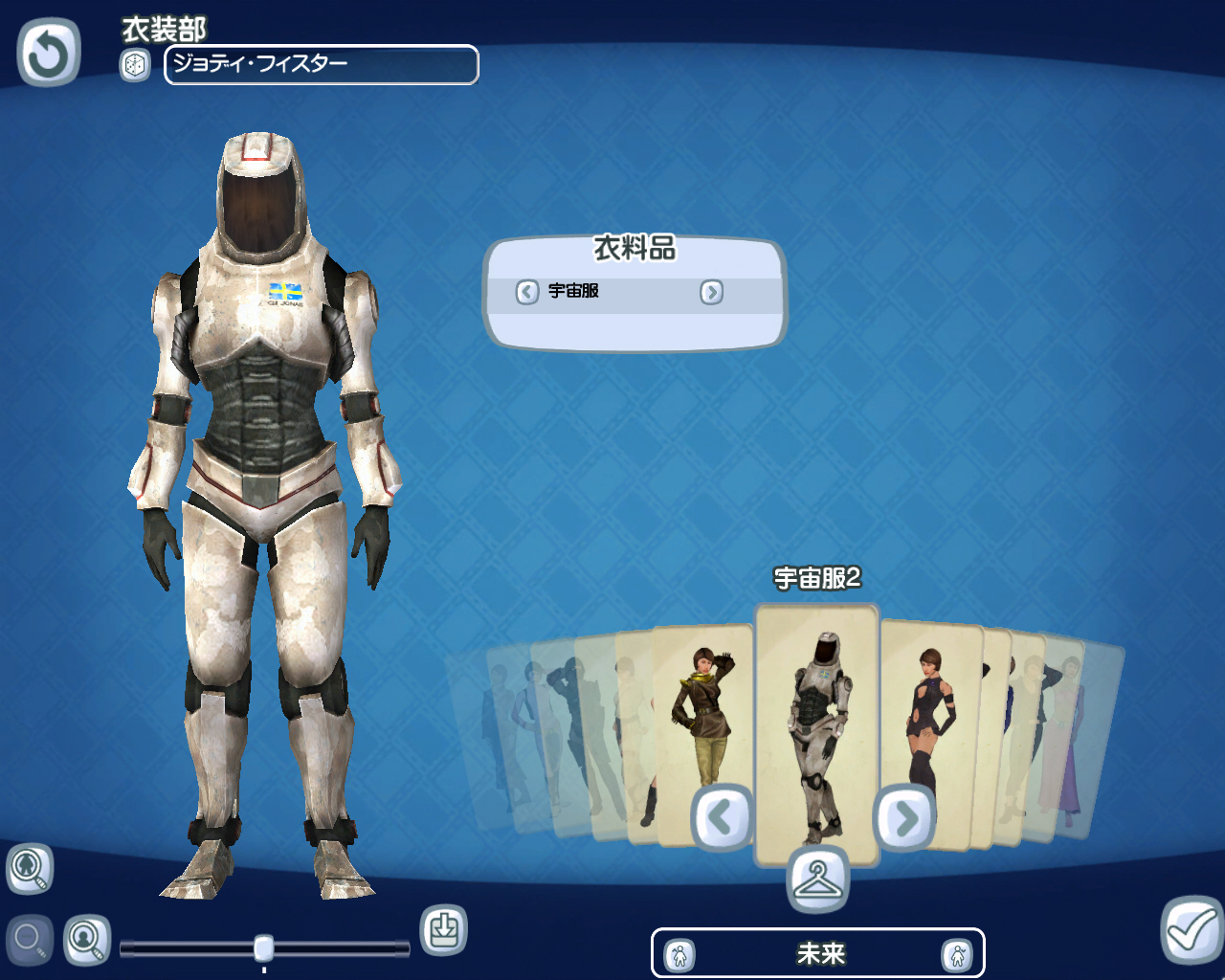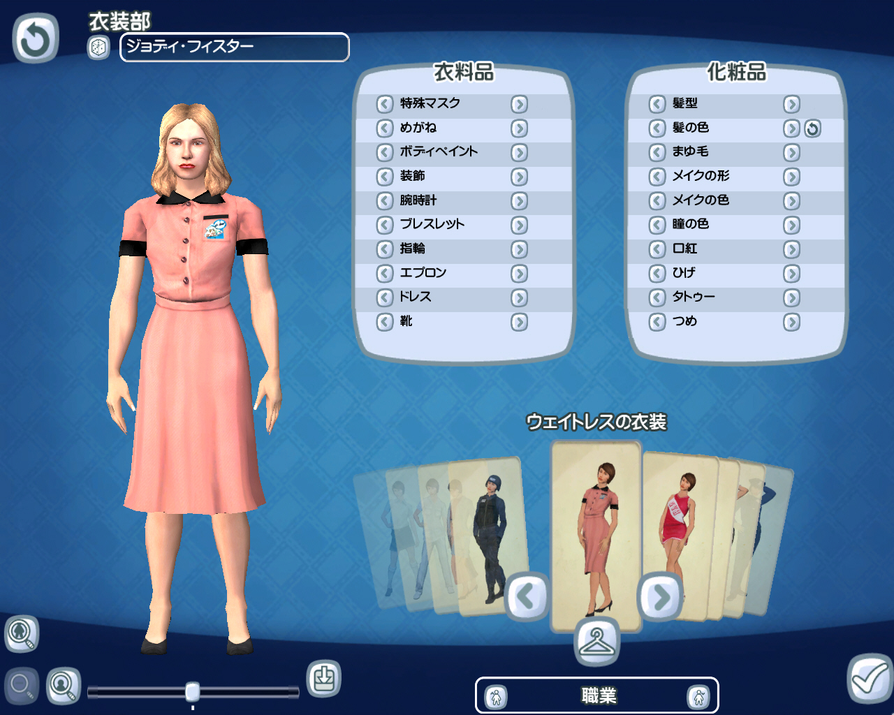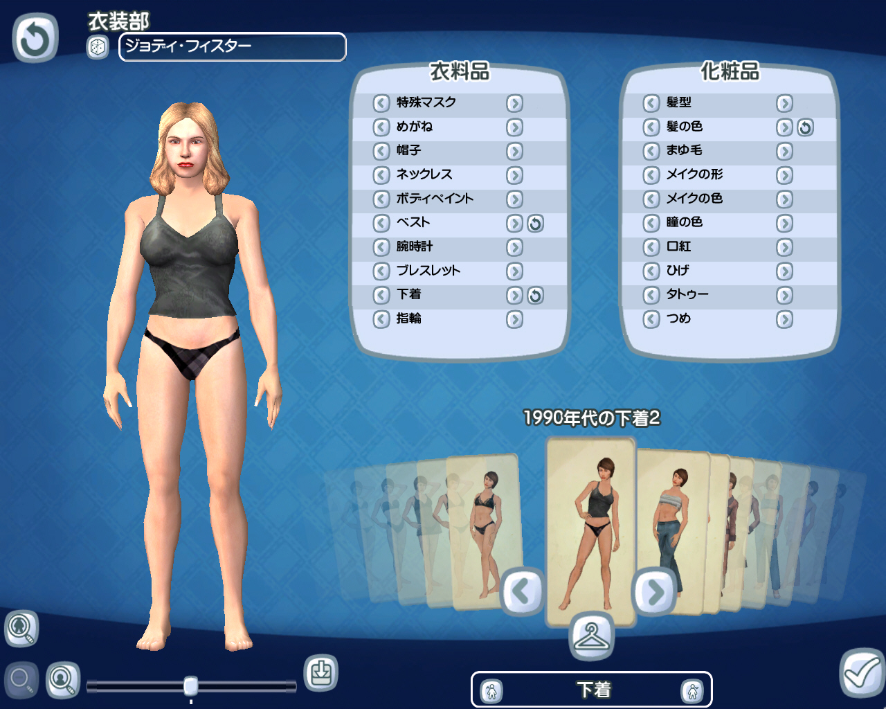 衣装は「カジュアル」「フォーマル」「下着」「職業」「軍隊」「西部」「未来」「モンスター」のカテゴリに分類され,ほとんどの衣装で複数のカラーやデザインが用意されている。また,衣装に合わせた靴やアクセサリの追加,髪型,メイクの変更などもできるので,スター達を着飾ってやろう。