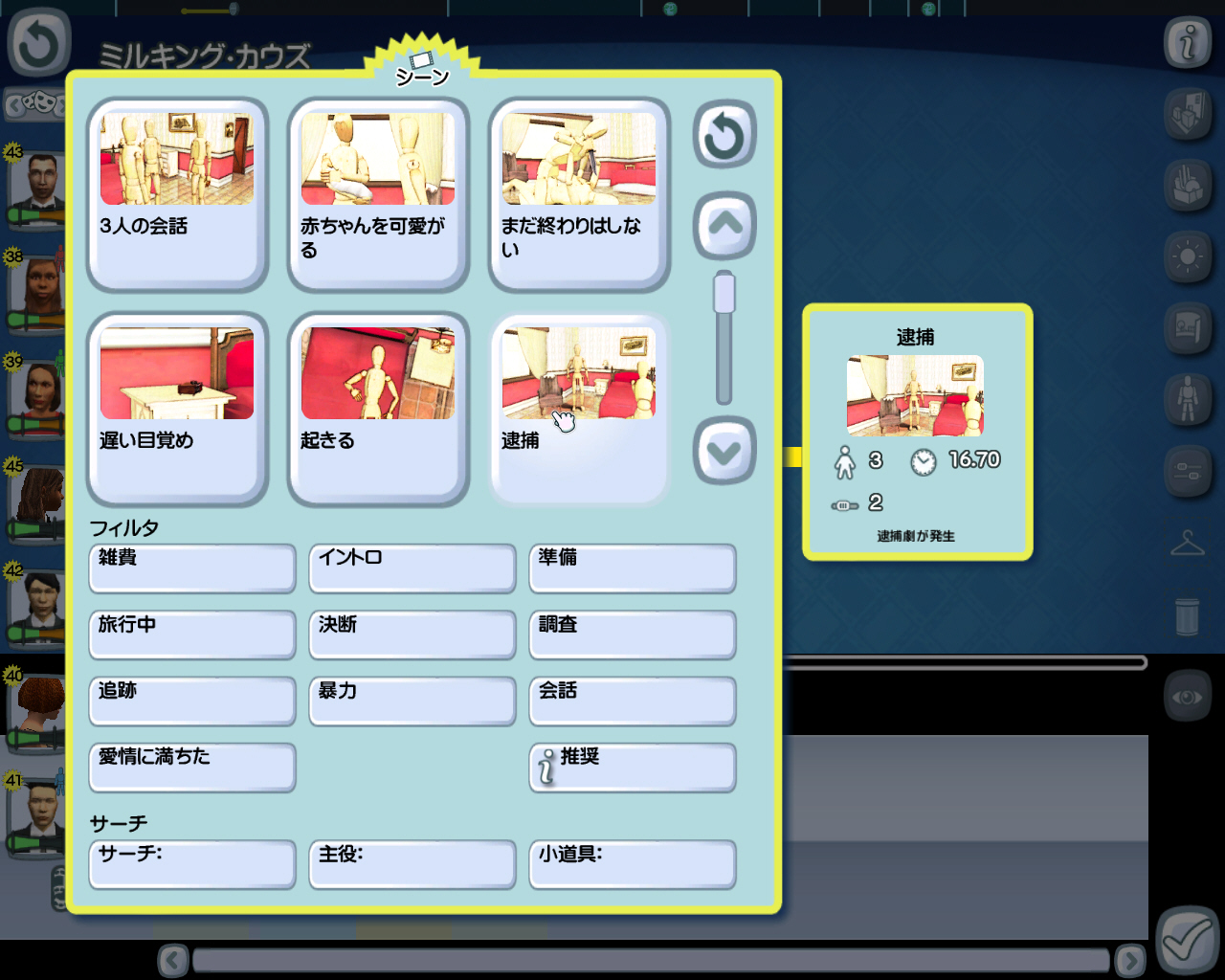 ご存じのとおり,本作の映画は各セットに用意される「シーン」を組み合わせて作っていく。「シーン」とは,カメラアングル,俳優の演技や動きなどがパターン化されたもので,セットごとに用意されたシーンは数十から数百も用意されている。セットによっては350種類以上のシーンを選択できるのだ。連載第3回,第4回のオリジナル映画作成などで触れてきたシーンは,ほんのごく一部に過ぎない。