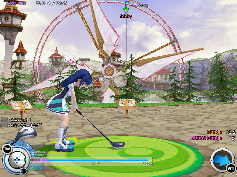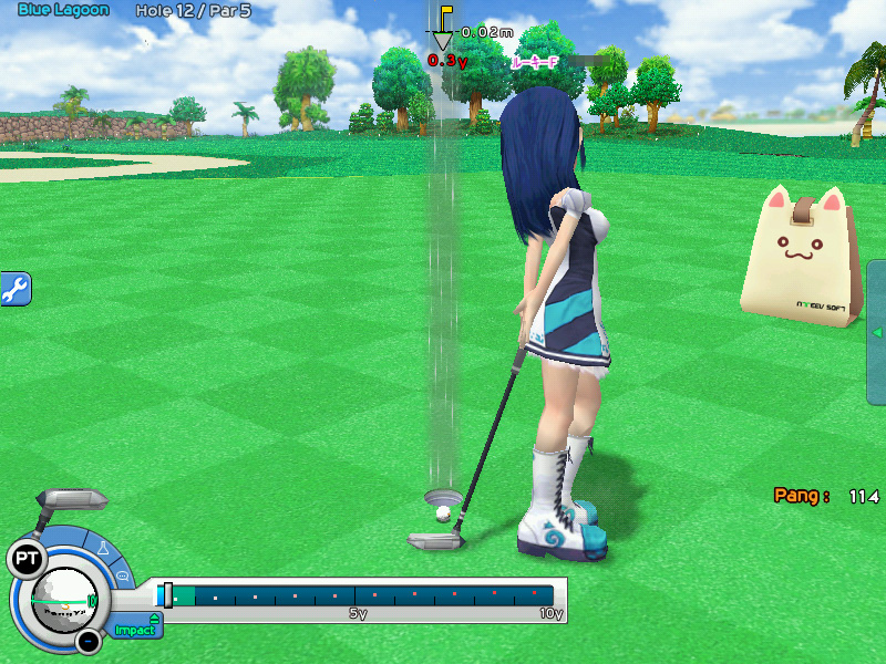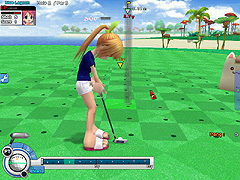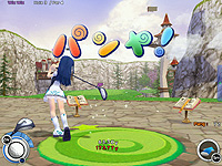 ゴルフゲームといってもいろいろあるが,パンヤはリアル指向ではなくライトなデザイン。断崖絶壁や軍艦の甲板といったユニークなコースを,可愛いキャラクターを操作して,さまざまなアイテムを駆使しながら回ってゆく。簡単操作で一度のプレイ時間も短く,ゴルフゲーム未経験者でもすんなり遊べるという,間口の広い内容だ。ゴルフゲームや可愛い系ゲームと縁のない筆者に白羽の矢が立ったのも,そういった理由かららしいが……。