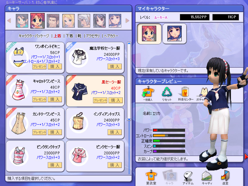 服などのアイテムを購入するために必要な通貨は,前回説明したとおりCP(現金で購入可能)とPP(ゲーム中に獲得)の2種類がある。CPとPPで買える服は別々に用意されており,現金を注ぎ込んだだけでも,プレイを長時間続けただけでも,全衣装は揃えられないという心憎い仕組みになっている。