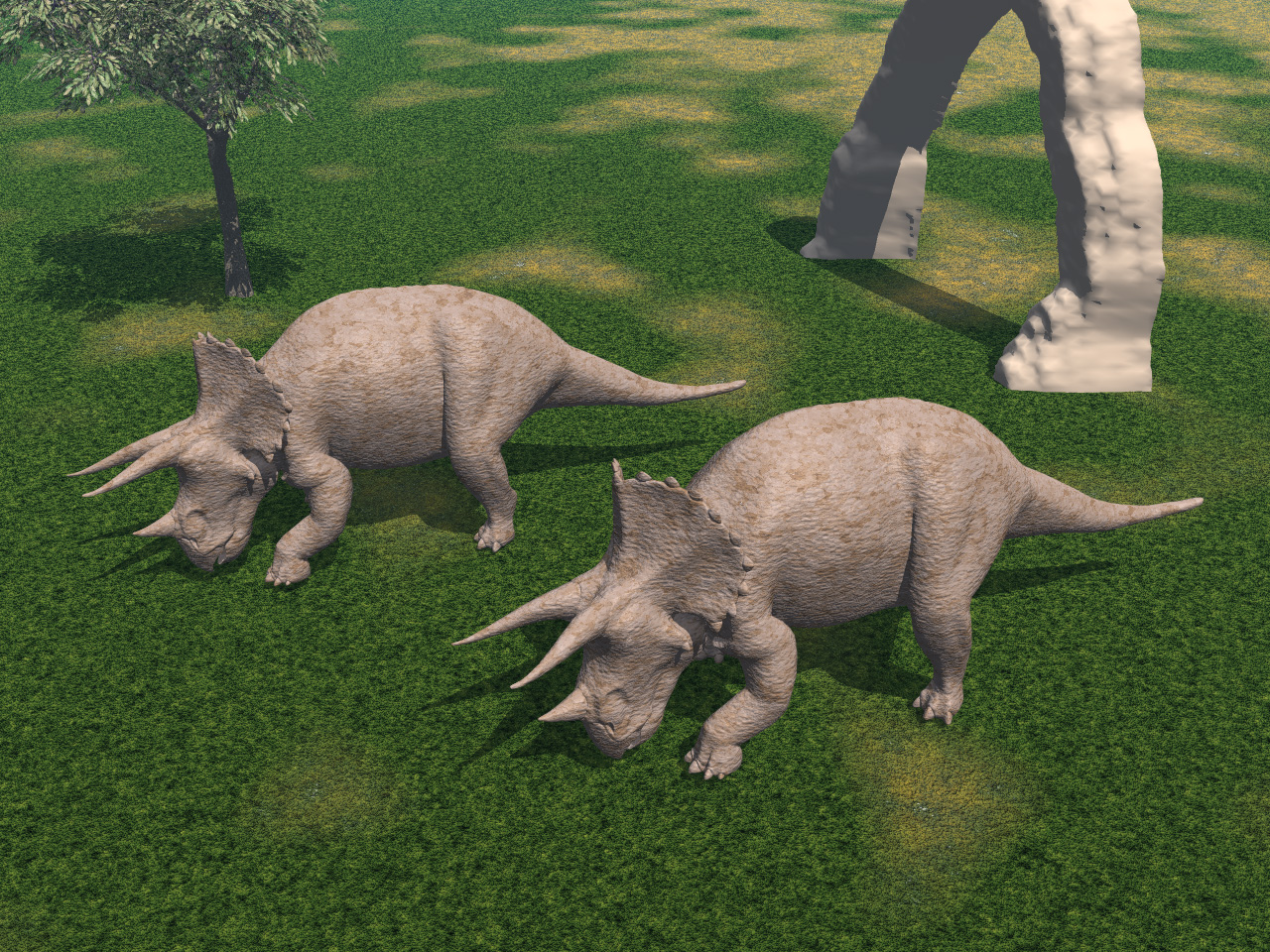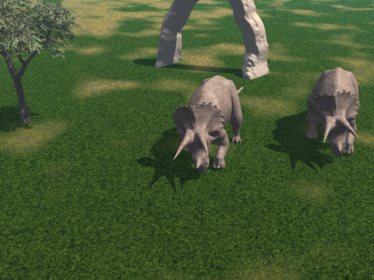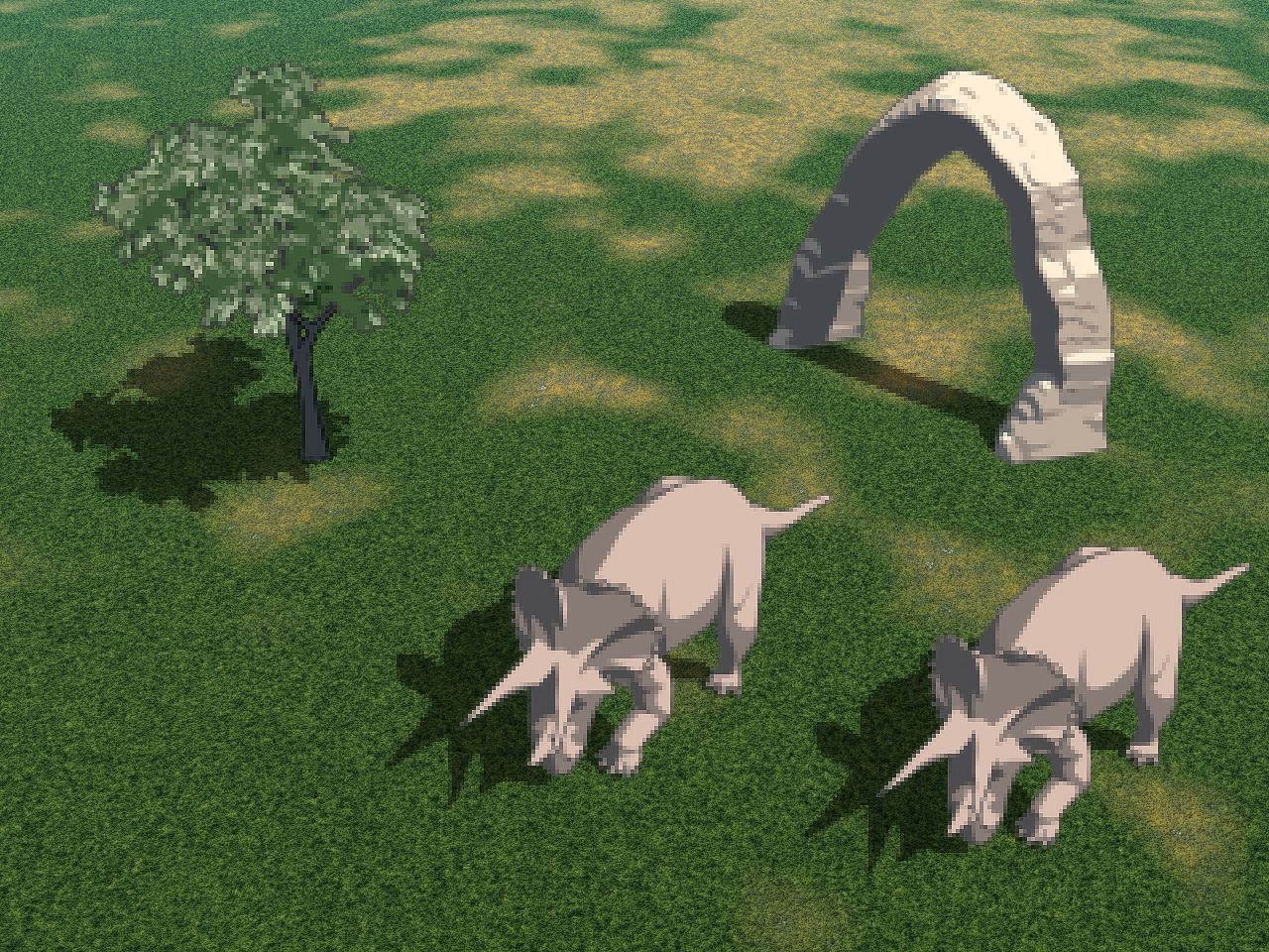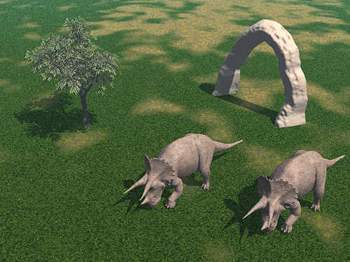 | 図1と同じような画面を,3Dグラフィックスで表現したところ。恐竜は“恐竜の絵を持ってきて貼っている”のではなく,視点(ここでは画面手前)から見て,違和感がないように一体一体“造られている”のが,微妙に異なる向きや,影の形から分かると思う |