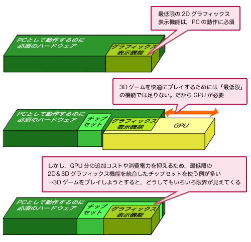 そこで考え出されたのが,「2Dグラフィックス表示機能と,最低限の3Dグラフィックス表示機能をセットにして,PCの動作に必須なハードウェアに統合する」アイデアだ。統合すれば,GPUを採用するデメリットを回避できるうえ,3Dグラフィックスを表示できないこともない。さらに,浮いたコストでテレビ録画機能などを充実させられたりできるということもあり,国内のPCメーカーの間では,積極的にこの統合策が採用されたのである(図2)。