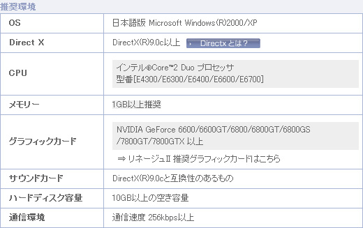 | リネージュII公式サイトにある推奨動作環境表から。「GeForce 6600以上」に「GeForce 7400」などは(クラスが低いので)含まれない。一方,「GeForce 7600」はクラスが同じで世代が新しい以上,(リストには挙がっていないが)対応している |