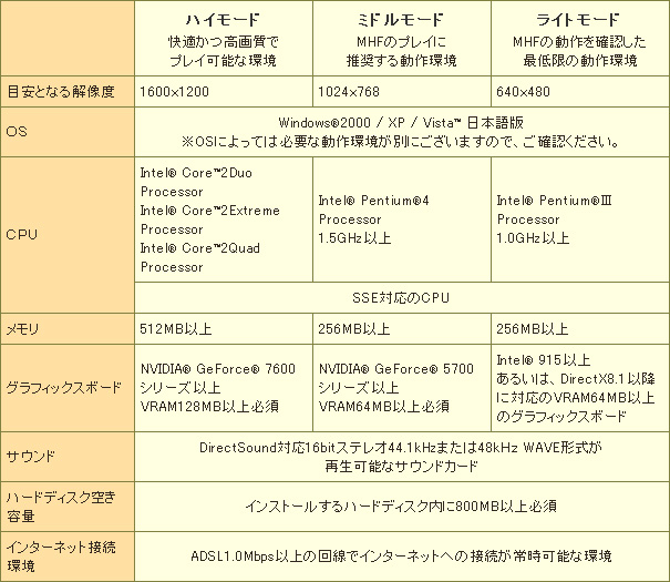 | 三段階の動作環境が提示されているモンスターハンター フロンティア オンラインより |