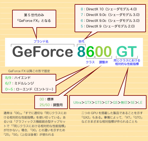 先ほど例示したGeForce 8600 GTを使って,GeForceの製品名の見方をチェックしてみよう。図1を見てほしい。