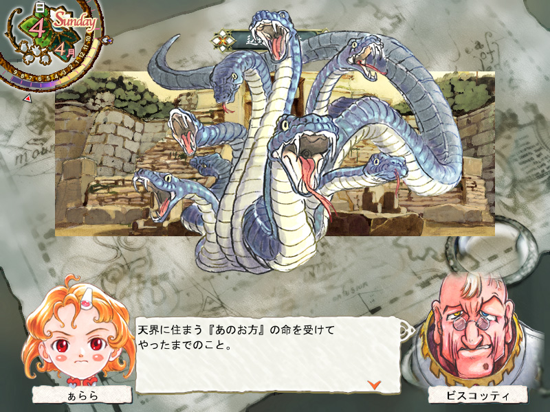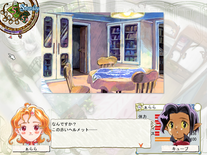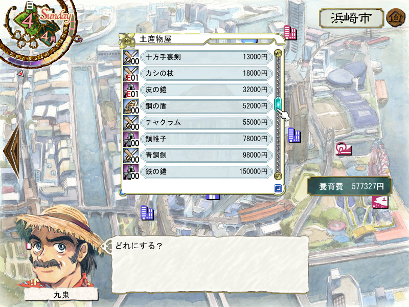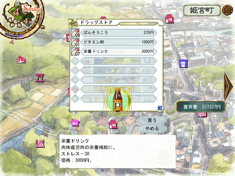 半年ほどもオカルト研究会に通わせていると,それなりに魔法スキルが向上し,「冒険」で利用できる魔法も増えてきた。いよいよ実戦投入の時である。冒険に出るにはそれなりの装備が欲しいところだが,これは土産物屋の「三階堂」で手に入る。魔法使いたるもの,「とんがり帽子」に乗って,いやいやかぶってビームとかを撃つ使い魔を三つ四つ使役したいものだが,魔法に役立つアイテムは杖以外売っていない。ぁらら専用装備は調達できないので,やむなく量産型の鎧と杖を買った。