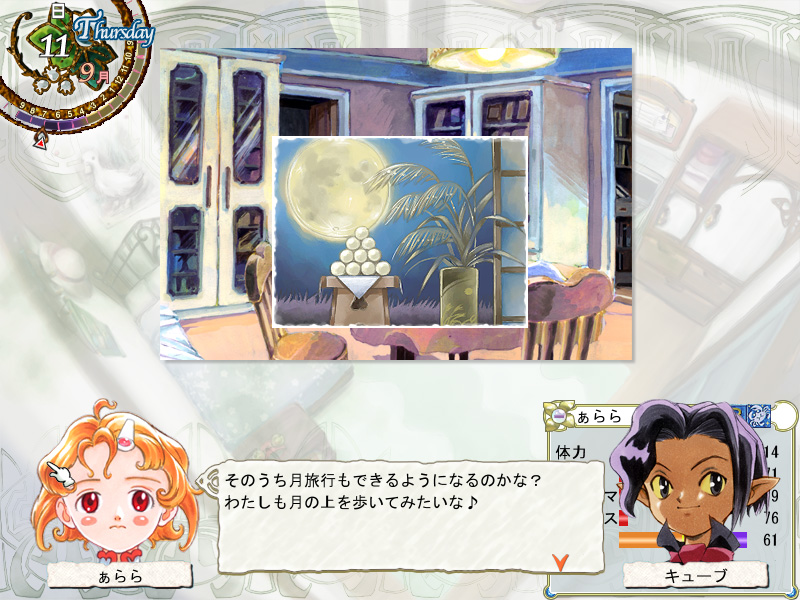 十五夜を見て,月の上を歩いてみたいと言うぁらら。そう,月にはD.O.M.E.があるらしいからねぇ……ってそれは作品が違ーう! ていうか,作品って何??? |