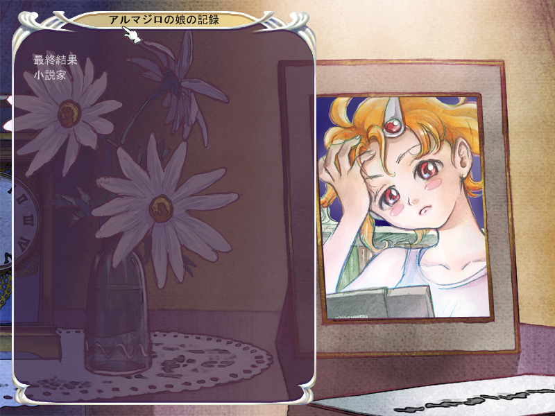 そうして迎える卒業式,娘の進路はどうなったかというと……どういうわけか「作家」なのである。いったいなぜこうなってしまったのだろう? 最後の2年間で向上に努めた言霊スキルと,必要以上に上がった「知力」のせいだろうか。また,気品やカリスマ,魅力といったパラメータが伸びきらず,人を導く存在になりきれなかったのかもしれない。
