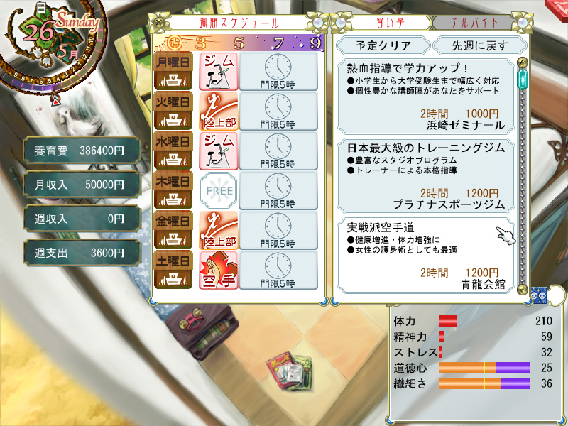 序盤の基本スケジュールは体力と運動能力,そして厳しい特訓に耐えるための精神力の向上に主眼を置いた。結果,ジム通いと空手道場,さらには部活と運動系ばかり。勉強は大丈夫なのだろうか?