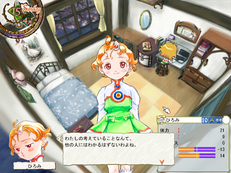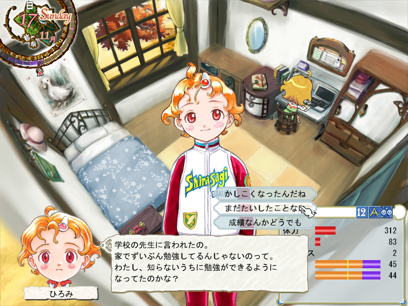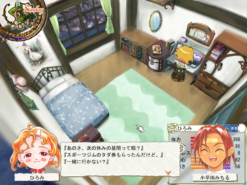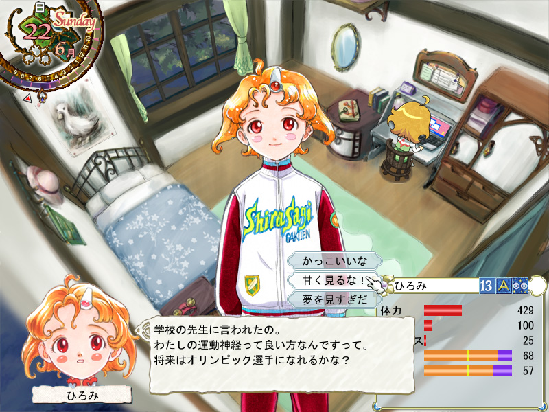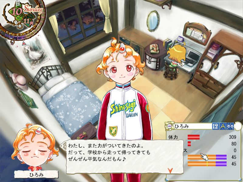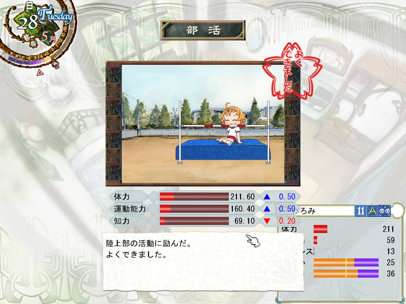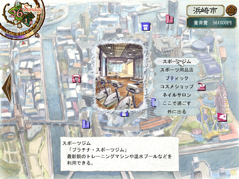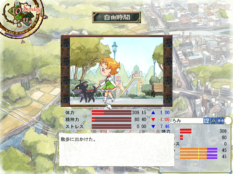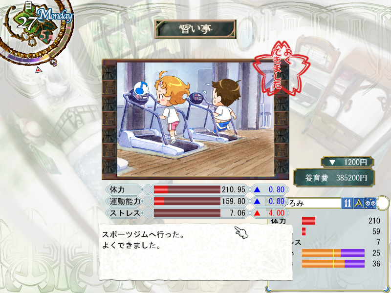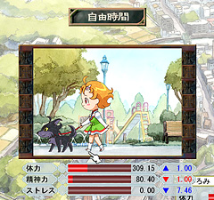 また,あまり体力のないうちは,ストレスが溜まりすぎないよう,とくに気をつける必要がある。休日は体を休めつつ,お父さんや猫のゴエ○ン……じゃなかった犬のキューブと一緒に「お出かけ」をして,ストレス解消に努めさせる。また,余裕があれば「市民スポーツセンター」や「ファッションビル」内の「スポーツジム」などで体を鍛えることを,忘れないようにする。