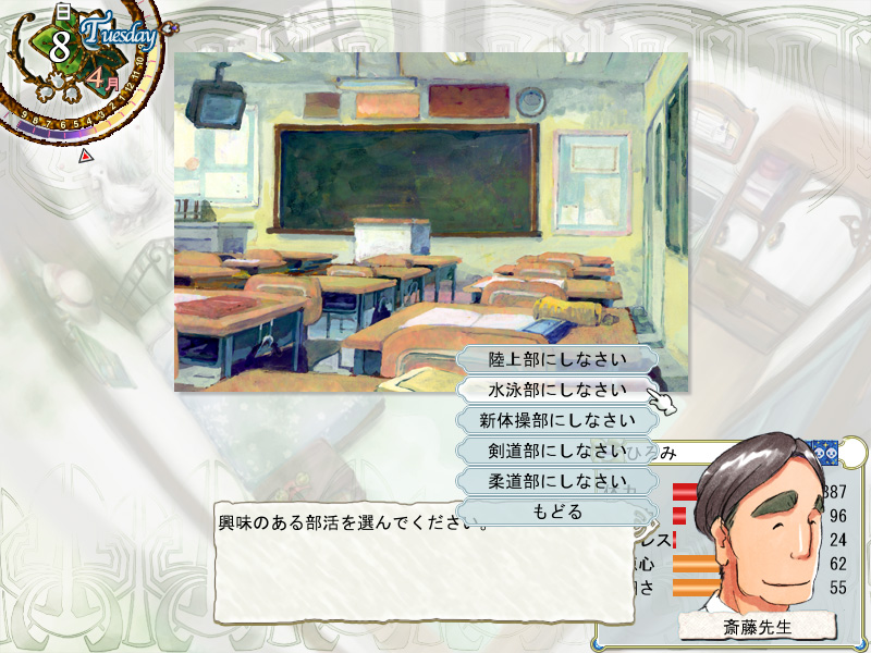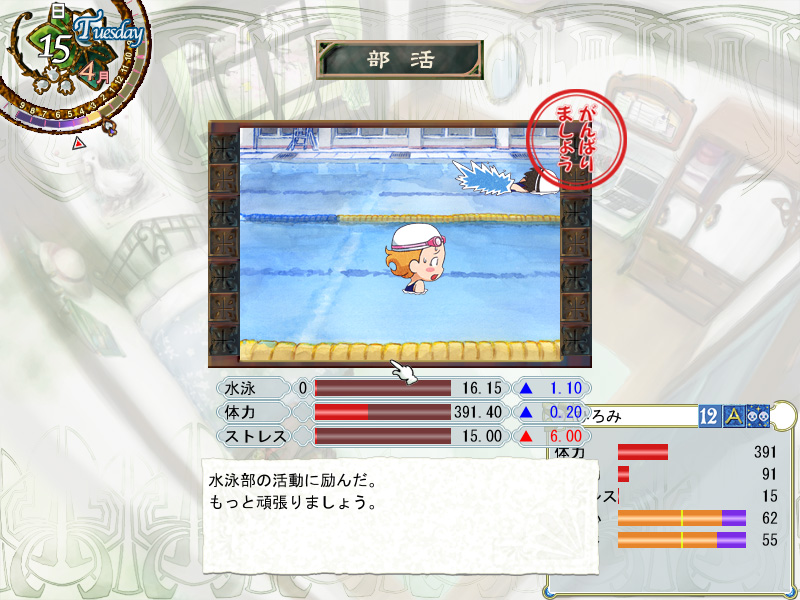 とまぁ,しょっぱなから「……これからどうしようか」という状況を迎えつつあるが,初志貫徹の姿勢こそスポーツマンの基本である。中学時代の週間スケジュールも基本路線どおり。基礎体力作りのためのジム通い,部活動による水泳スキルの向上に加え,休日は「お出かけ」でストレスを解消するとともに,市民スポーツセンターのプールでお父さん自らコーチとして指導することも忘れない。