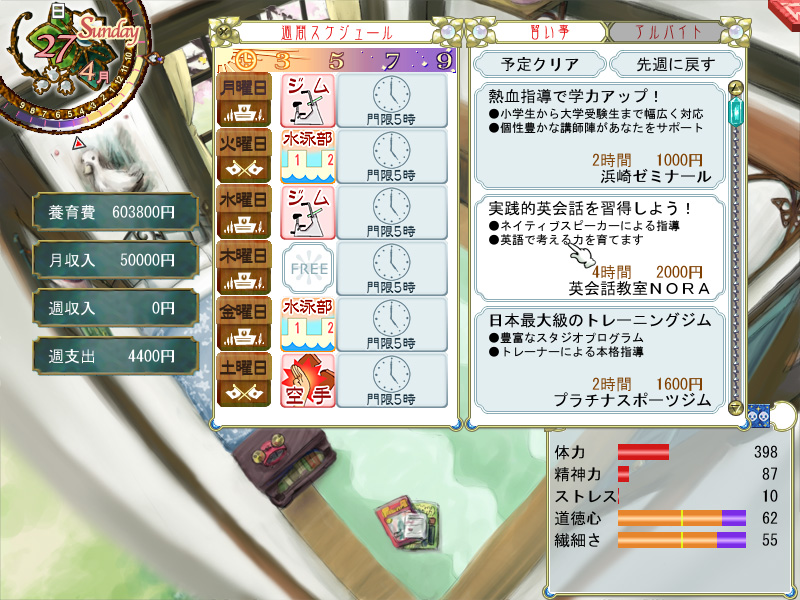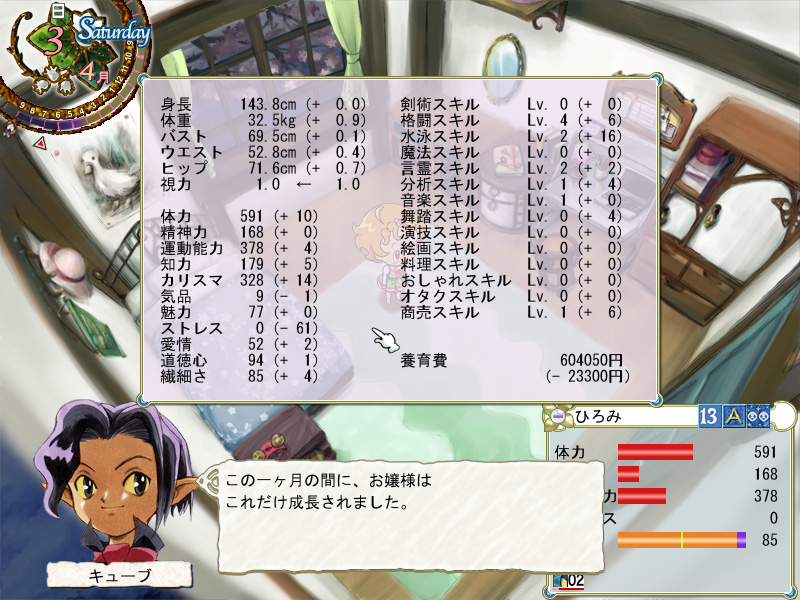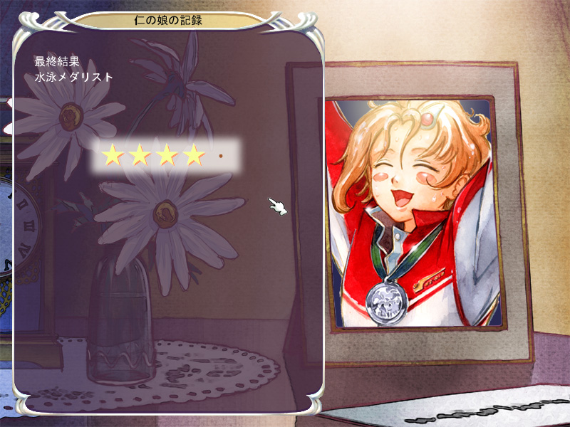 しかし,ここまでアスリートとしての能力ばかり磨いてきたせいか,気品や魅力といったパラメータの低さが目につくようになった。選手としての能力にはおそらくそれほど影響しない部分ではあるが,年頃の女の子としてどうなのかということもあるし,今後世界に羽ばたいたあかつきに,華やかさに欠けるのは望ましくない。